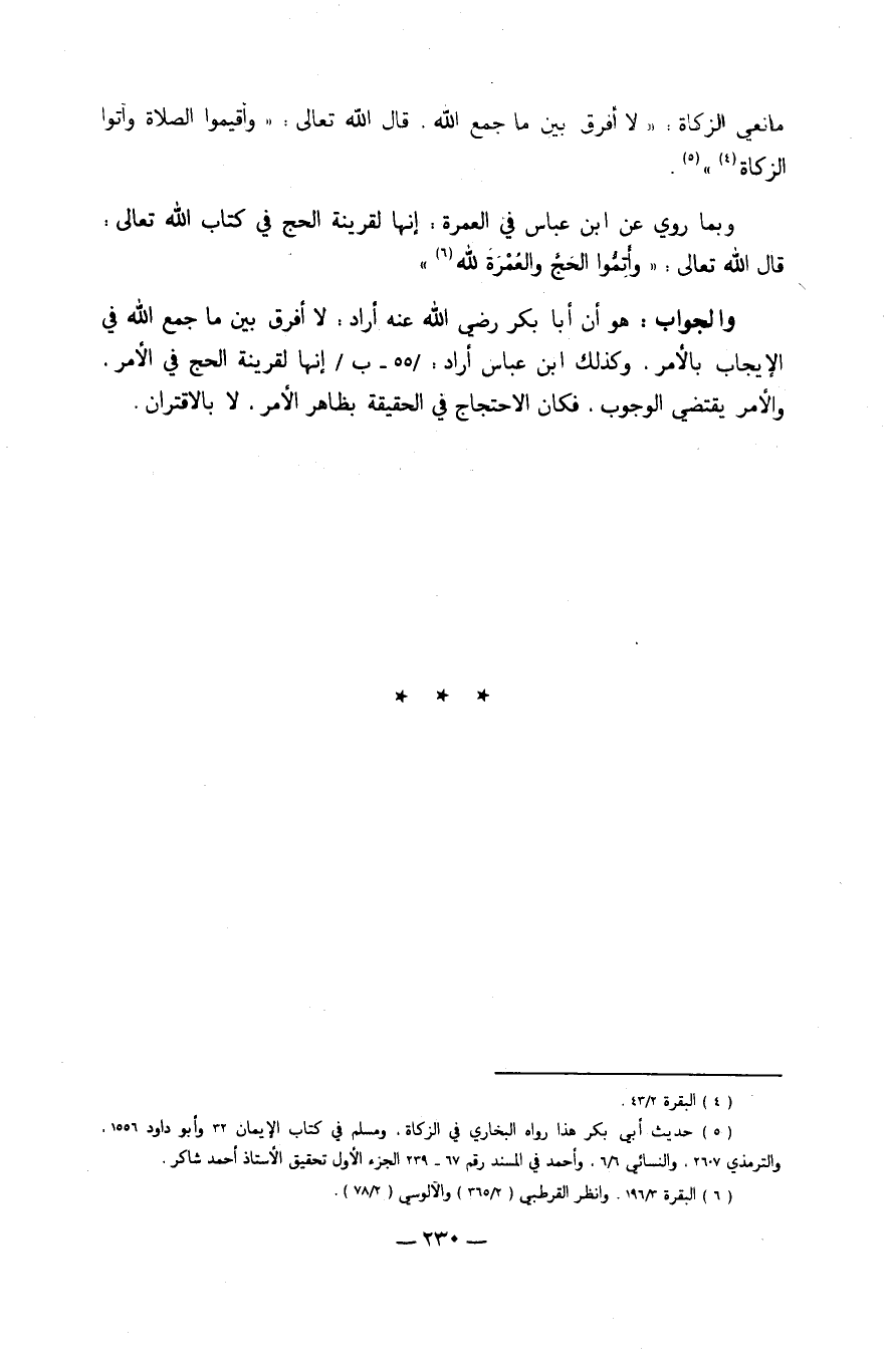 وَالْجَوَاب هُوَ أَن أَبَا أَنا بكر رَضِي الله عَنهُ أَرَادَ لَا أفرق بَين مَا جمع الله فِي الْإِيجَاب بِالْأَمر وَكَذَلِكَ ابْن عَبَّاس إِنَّهَا لقَرِينَة الْحَج فِي الْأَمر وَالْأَمر يَقْتَضِي الْوُجُوب فَكَانَ الِاحْتِجَاج فِي الْحَقِيقَة بِظَاهِر الْأَمر لَا بالاقتران
