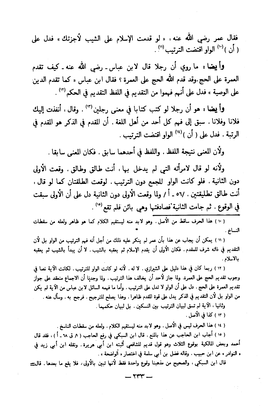 فَقَالَ عمر رَضِي الله عَنهُ لَو قدمت الْإِسْلَام على الشيب لأجزتك فَدلَّ على أَن الْوَاو اقْتَضَت التَّرْتِيب