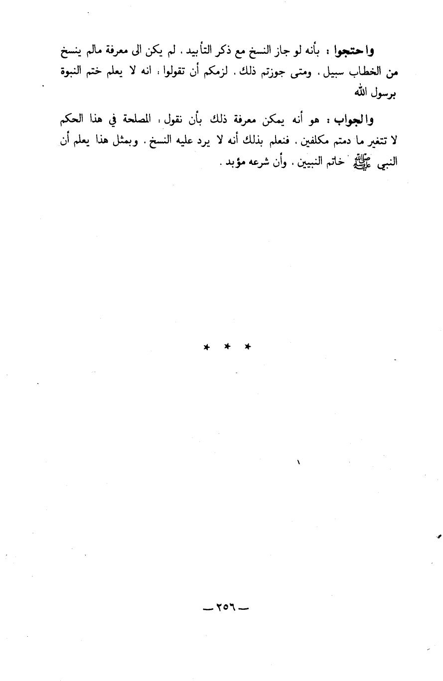 وَاحْتَجُّوا بِأَنَّهُ لَو جَازَ النّسخ مَعَ ذكر التأييد لم يكن إِلَى معرفَة مالم ينْسَخ من الْخطاب سَبِيل وَمَتى جوزتم ذَلِك لزمكم أَن تَقولُوا أَنه لَا يعلم ختم النُّبُوَّة برَسُول الله