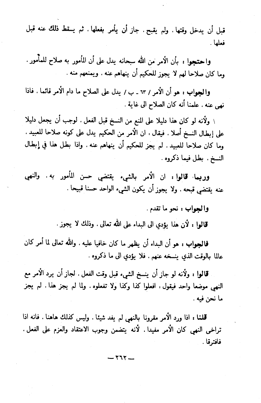 وَلِأَنَّهُ لَو كَانَ هَذَا دَلِيلا على الْمَنْع من النّسخ قبل الْفِعْل لوَجَبَ أَن يَجْعَل دَلِيلا على إبِْطَال النّسخ أصلا فَيُقَال إِن الْأَمر من الْحَكِيم يدل على كَونه صلاحا للعبيد وَمَا كَانَ صلاحا للعبيد لم يجز للحكيم أَن ينهاهم عَنهُ وَإِذا بَطل هَذَا فِي إبِْطَال النّسخ بَطل فِيمَا ذَكرُوهُ