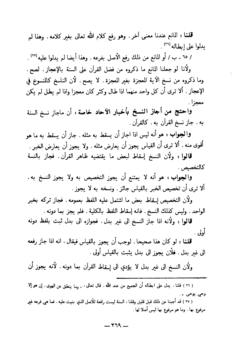 ولأنا لَو جعلنَا الْمَانِع مَا ذَكرُوهُ من فضل الْقُرْآن على السّنة بالإعجاز لصَحَّ وَمَا ذَكرُوهُ من نسخ الْآيَة المعجزة بِغَيْر المعجزة لَا يَصح لِأَن النَّاسِخ كالمنسوخ فِي الإعجاز أَلا ترى أَن كل وَاحِد مِنْهُمَا إِذا طَال وَكثر كَانَ معجزا وَإِذا لم يطلّ لم يكن معجزا