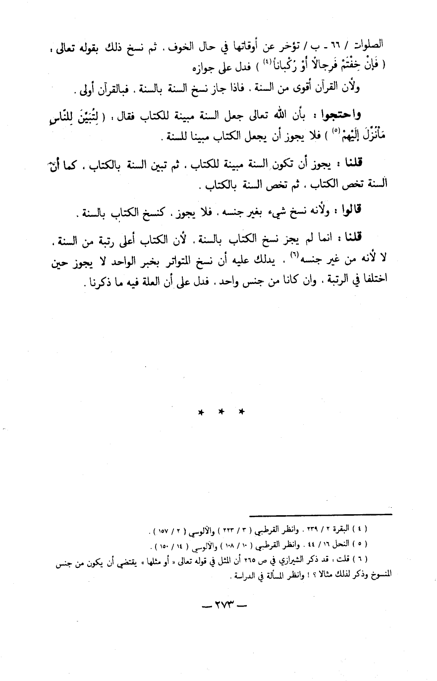 قُلْنَا إِنَّمَا لم يجز نسخ الْكتاب بِالسنةِ لِأَن الْكتاب أَعلَى رُتْبَة من السّنة لَا لِأَنَّهُ من غير جنسه يدلك عَلَيْهِ أَن نسخ الْمُتَوَاتر بِخَبَر الْوَاحِد لَا يجوز حِين اخْتلفَا فِي الرُّتْبَة وَإِن كَانَا من جنس وَاحِد فَدلَّ على أَن الْعلَّة فِيهِ مَا ذكرنَا