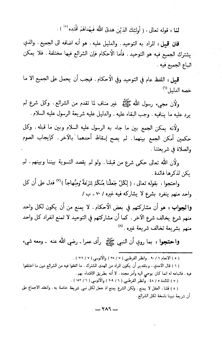 وَالْجَوَاب هُوَ أَن مشاركتهم فِي بعض الْأَحْكَام لَا يمْنَع من أَن يكون لكل وَاحِد مِنْهُم شرع يُخَالف شرع الآخر كَمَا أَن مشاركتهم فِي التَّوْحِيد لَا تمنع انْفِرَاد كل وَاحِد مِنْهُم بشريعة تخَالف شَرِيعَة غَيره