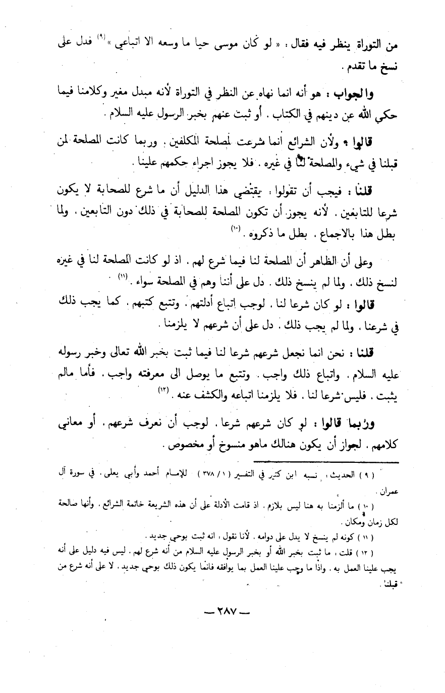 وَالْجَوَاب هُوَ أَنه إِنَّمَا نَهَاهُ عَن النّظر فِي التَّوْرَاة لِأَنَّهُ مبدل مغير وكلامنا فِيمَا حكى الله عَن دينهم فِي الْكتاب أَو ثَبت عَنْهُم بِخَبَر الرَّسُول عَلَيْهِ السَّلَام