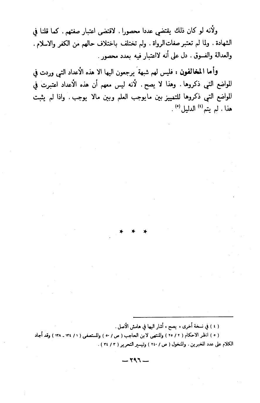 وَأما المخالفون فَلَيْسَ لَهُم شُبْهَة يرجعُونَ إِلَيْهَا إِلَّا هَذِه الْأَعْدَاد الَّتِي وَردت فِي الْمَوَاضِع الَّتِي ذكروها وَهَذَا لَا يَصح لِأَنَّهُ لَا لَيْسَ مَعَهم أَن هَذِه الْأَعْدَاد اعْتبرت فِي الْمَوَاضِع الَّتِي ذكروها للتمييز بَين مَا يُوجب الْعلم وَبَين مَالا يُوجب وَإِذا لم يثبت هَذَا لم يتم الدَّلِيل