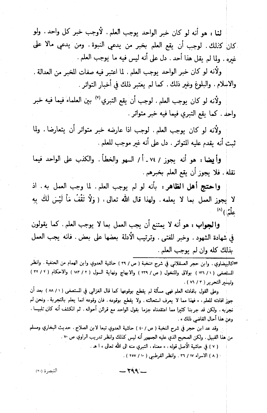 وَلِأَنَّهُ لَو كَانَ يُوجب الْعلم لوَجَبَ أَن يَقع التبري بَين الْعلمَاء فِيمَا فِيهِ خبر وَاحِد كَمَا يَقع التبري فِيمَا فِيهِ خبر متواتر
