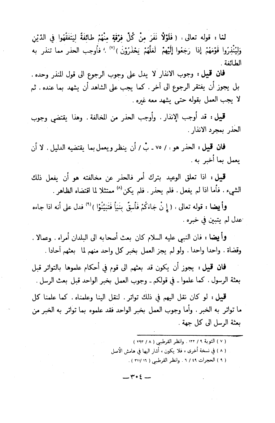 فَإِن قيل وجوب الْإِنْذَار لَا يدل على وجوب الرُّجُوع إِلَى قَول الْمُنْذر وَحده بل يجوز أَن يفْتَقر الرُّجُوع إِلَى آخر كَمَا يجب على الشَّاهِد أَن يشْهد بِمَا عِنْده ثمَّ لَا يجب الْعَمَل بقوله حَتَّى يشْهد مَعَه غَيره