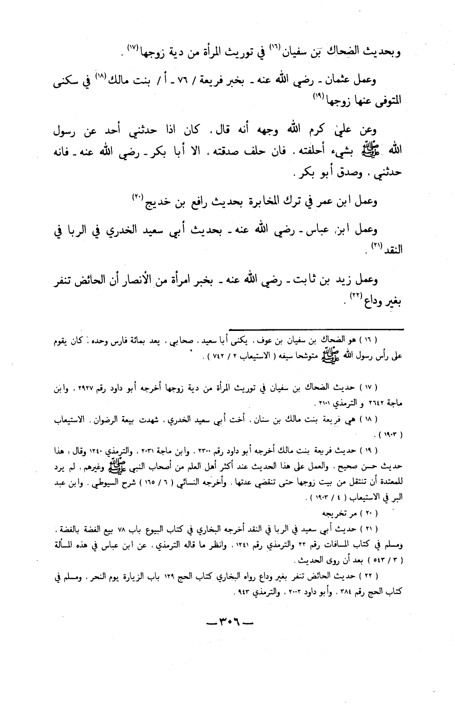 وَعمل عُثْمَان رَضِي الله عَنهُ بِخَبَر فريعة بنت مَالك فِي سُكْنى الْمُتَوفَّى عَنْهَا زَوجهَا