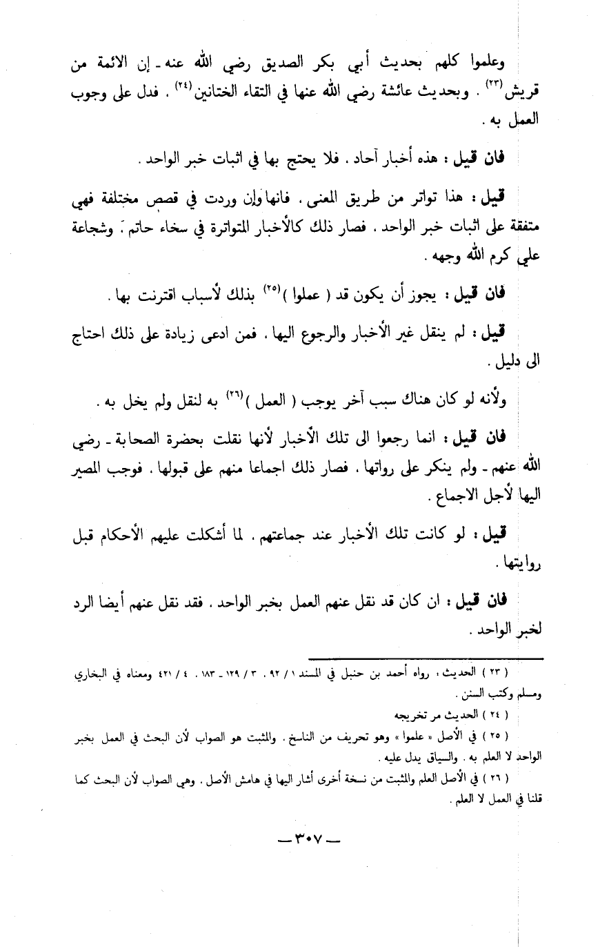 وَعَلمُوا كلهم بِحَدِيث أبي بكر الصّديق رَضِي الله عَنهُ إِن الْأَئِمَّة من قُرَيْش وَبِحَدِيث عَائِشَة رَضِي الله عَنْهَا فِي التقاء الختانين فَدلَّ على وجوب الْعَمَل بِهِ