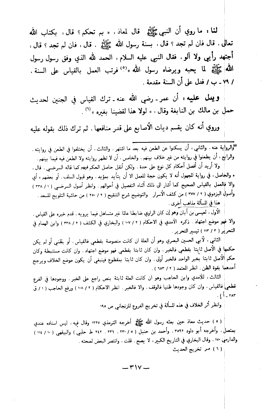 لنا مَا رُوِيَ أَن النَّبِي صلى الله عَلَيْهِ وَسلم قَالَ لِمعَاذ بِمَ تحكم قَالَ بِكِتَاب الله تَعَالَى قَالَ فَإِن لم تَجِد قَالَ بِسنة رَسُول الله صلى الله عَلَيْهِ وَسلم قَالَ فَإِن لم تَجِد قَالَ أجتهد رَأْيِي وَلَا آلو فَقَالَ النَّبِي عَلَيْهِ السَّلَام الْحَمد لله الَّذِي وفْق رَسُول رَسُول الله صلى الله عَلَيْهِ وَسلم لما يُحِبهُ ويرضاه رَسُول الله فرتب الْعَمَل بِالْقِيَاسِ على السّنة فَدلَّ على أَن السّنة مُقَدّمَة