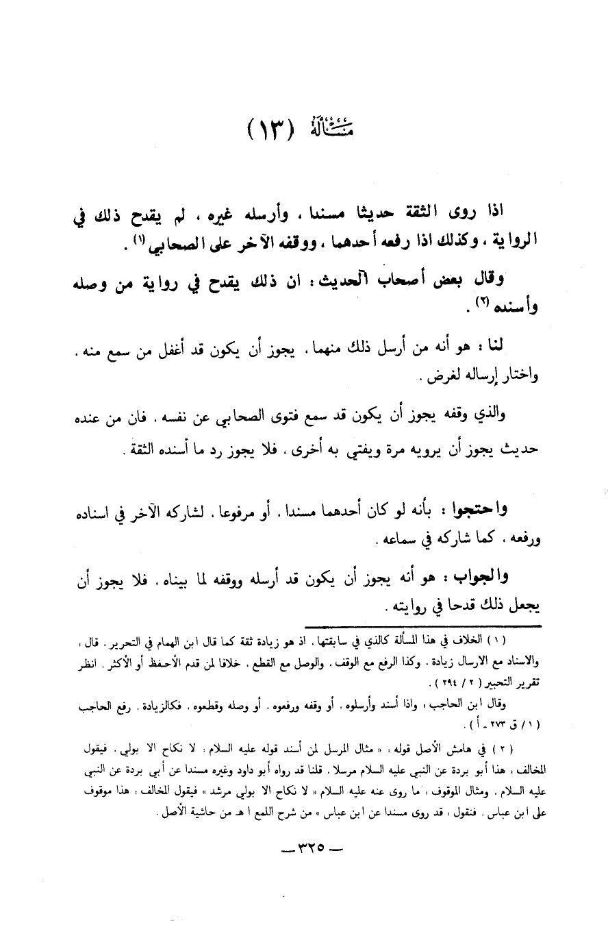 إِذا روى الثِّقَة حَدِيثا مُسْندًا وأرسله غَيره لم يقْدَح ذَلِك فِي الرِّوَايَة وَكَذَلِكَ إِذا رَفعه أَحدهمَا ووقه الآخر على الصَّحَابِيّ