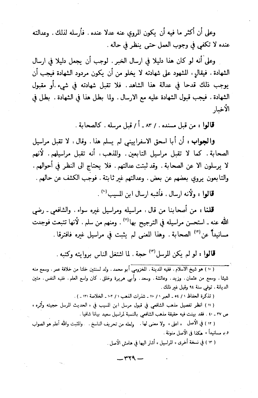 وَالْجَوَاب أَن أَبَا إِسْحَق الإِسْفِرَايِينِيّ لم يسلم هَذَا لَا تقبل مَرَاسِيل الصَّحَابَة كَمَا لَا تقبل مَرَاسِيل التَّابِعين وَالْمذهب أَنه تقبل مراسيلهم لأَنهم لَا يرسلون إِلَّا عَن الصَّحَابَة وَقد ثبتَتْ عدالتهم فَلَا يحْتَاج إِلَى النّظر فِي أَحْوَالهم والتابعون يروي بَعضهم عَن بعض وعدالتهم غير ثَابِتَة فَوَجَبَ الْكَشْف عَن حَالهم