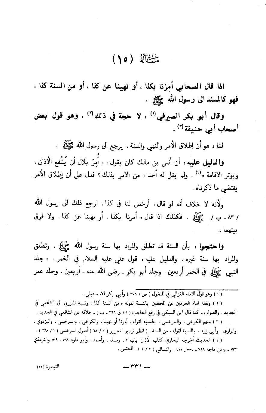 إِذا قَالَ الصَّحَابِيّ أمرنَا بِكَذَا أَو نهينَا عَن كَذَا أَو من السّنة كَذَا فَهُوَ كالمسند إِلَى رَسُول الله صلى الله عَلَيْهِ وَسلم