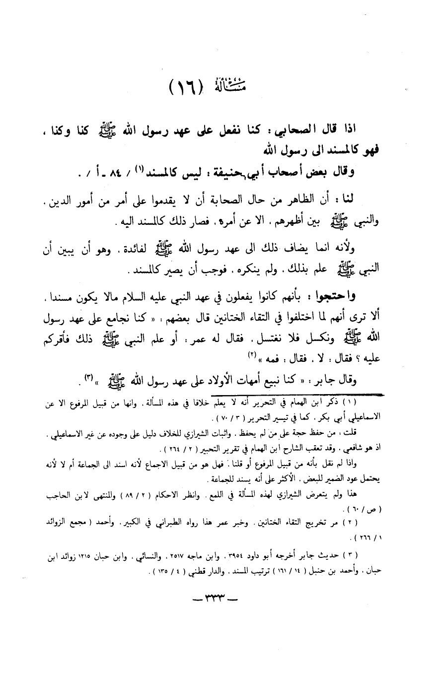 إِذا قَالَ الصَّحَابِيّ كُنَّا نَفْعل على عهد رَسُول الله صلى الله عَلَيْهِ وَسلم كَذَا وَكَذَا فَهُوَ كالمسند إِلَى رَسُول الله