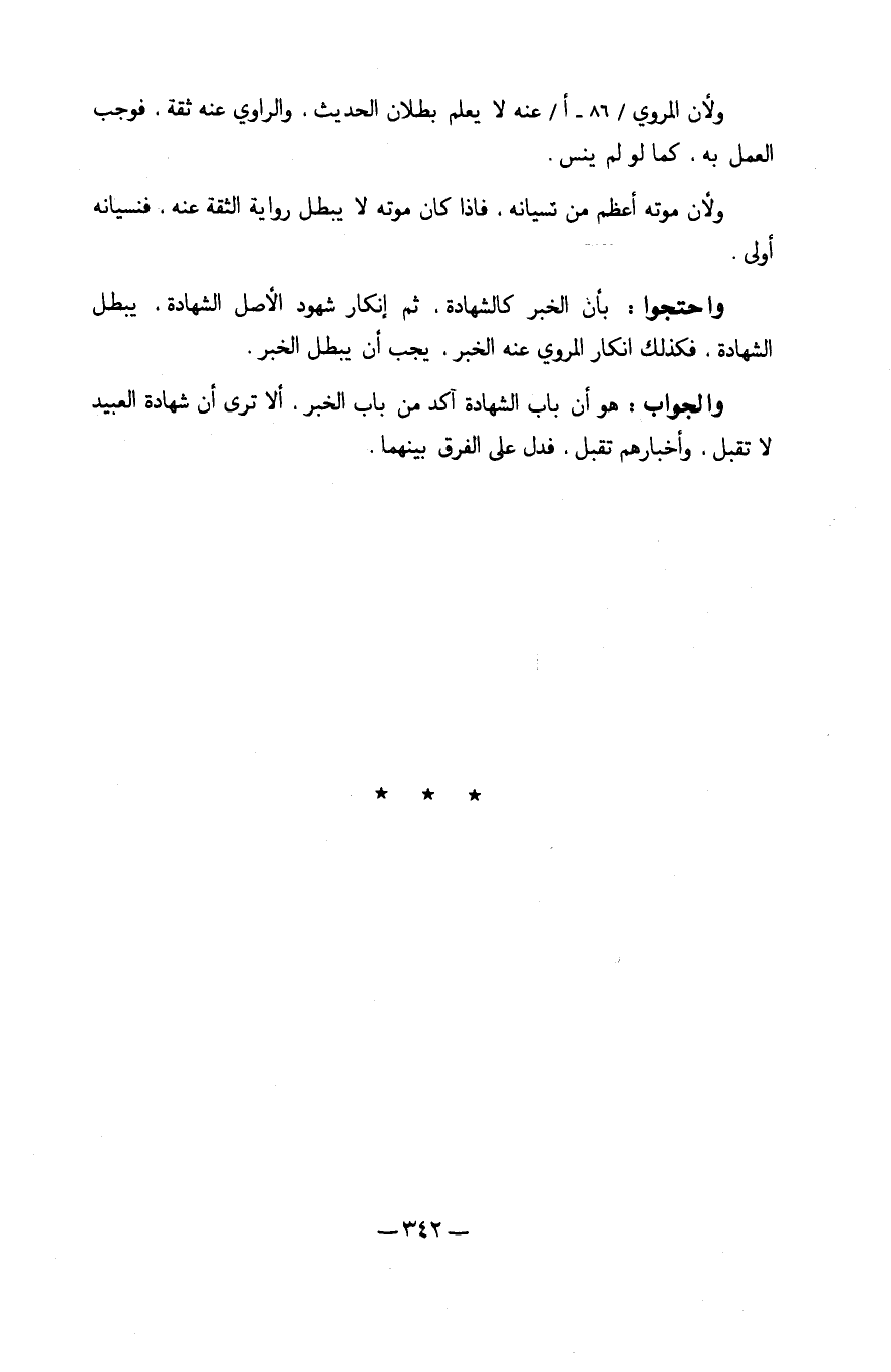 وَاحْتَجُّوا بِأَن الْخَبَر كَالشَّهَادَةِ ثمَّ إِنْكَار شُهُود الأَصْل الشَّهَادَة يبطل الشَّهَادَة فَكَذَلِك إِنْكَار الْمَرْوِيّ عَنهُ الْخَبَر يجب أَن يبطل الْخَبَر