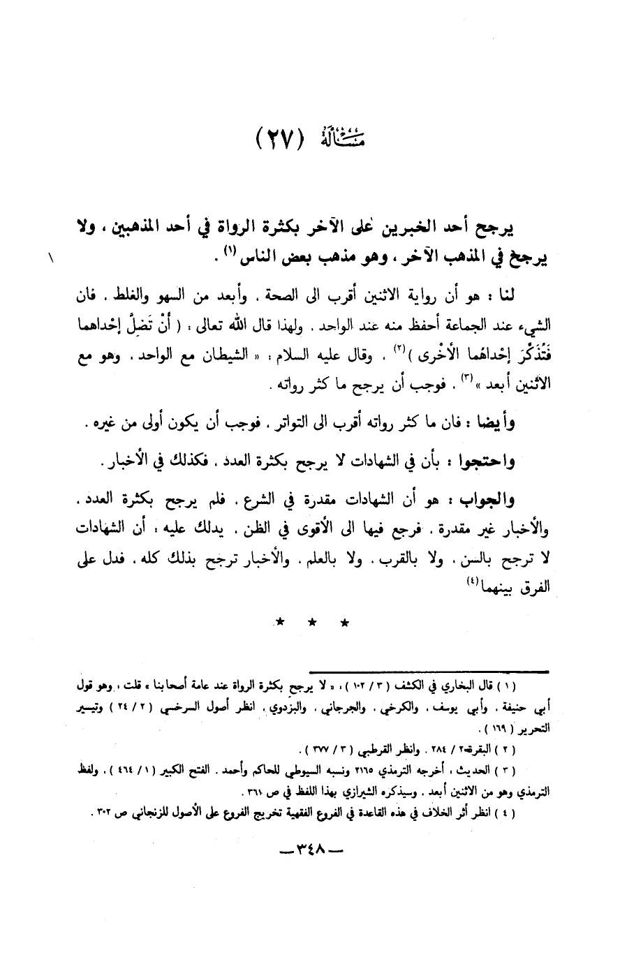 يرجح أحد الْخَبَرَيْنِ على الآخر بِكَثْرَة الروَاة فِي أحد المذهبين وَلَا يرجح فِي الْمَذْهَب الآخر وَهُوَ مَذْهَب بعض النَّاس