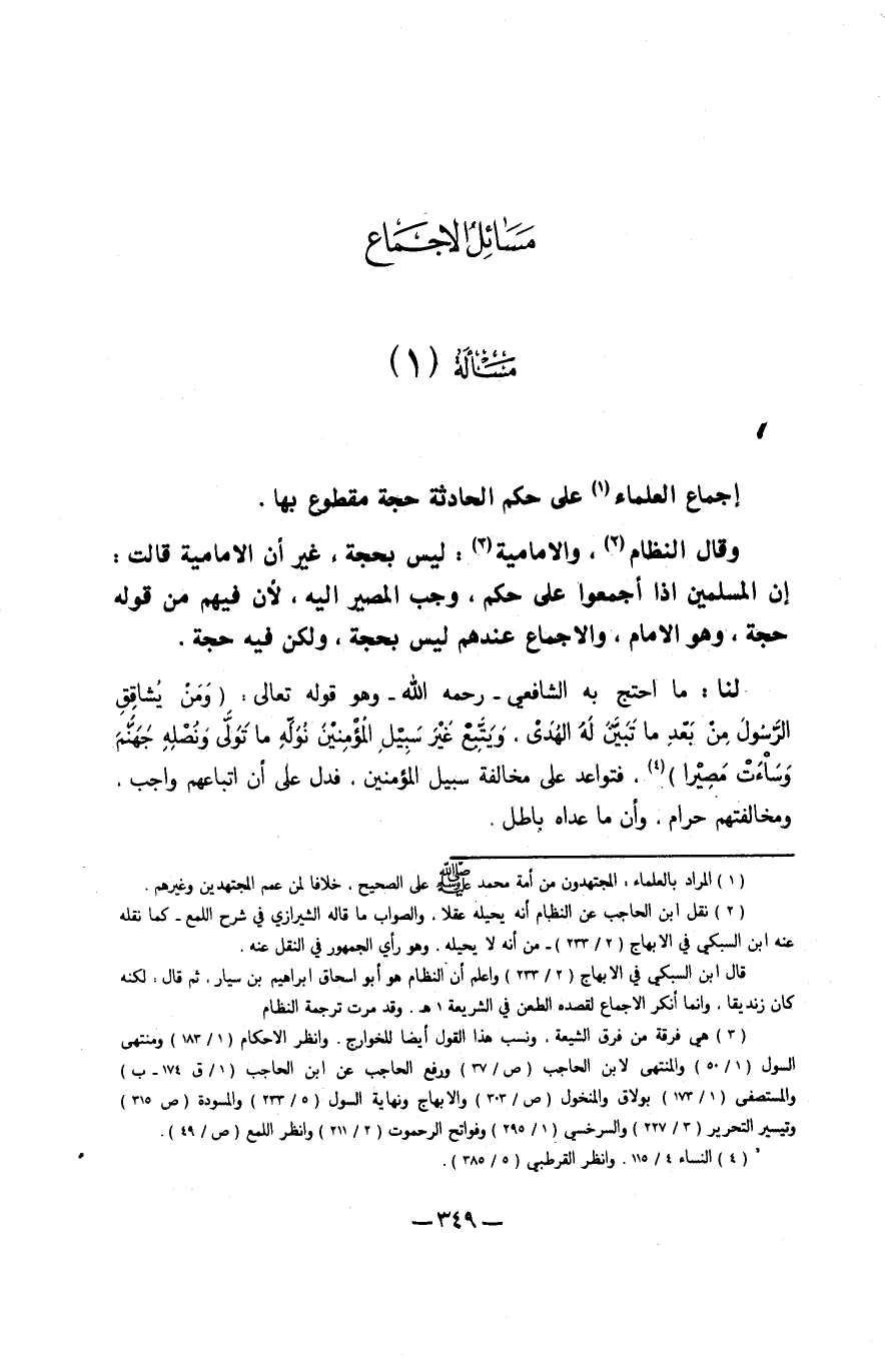 وَقَالَ النظام والإمامية لَيْسَ بِحجَّة غير أَن الإمامية قَالَت إِن الْمُسلمين إِذا أَجمعُوا على حكم وَجب الْمصير إِلَيْهِ لِأَن فيهم من قَوْله حجَّة وَهُوَ الإِمَام وَالْإِجْمَاع عِنْدهم لَيْسَ بِحجَّة وَلَكِن فِيهِ حجَّة