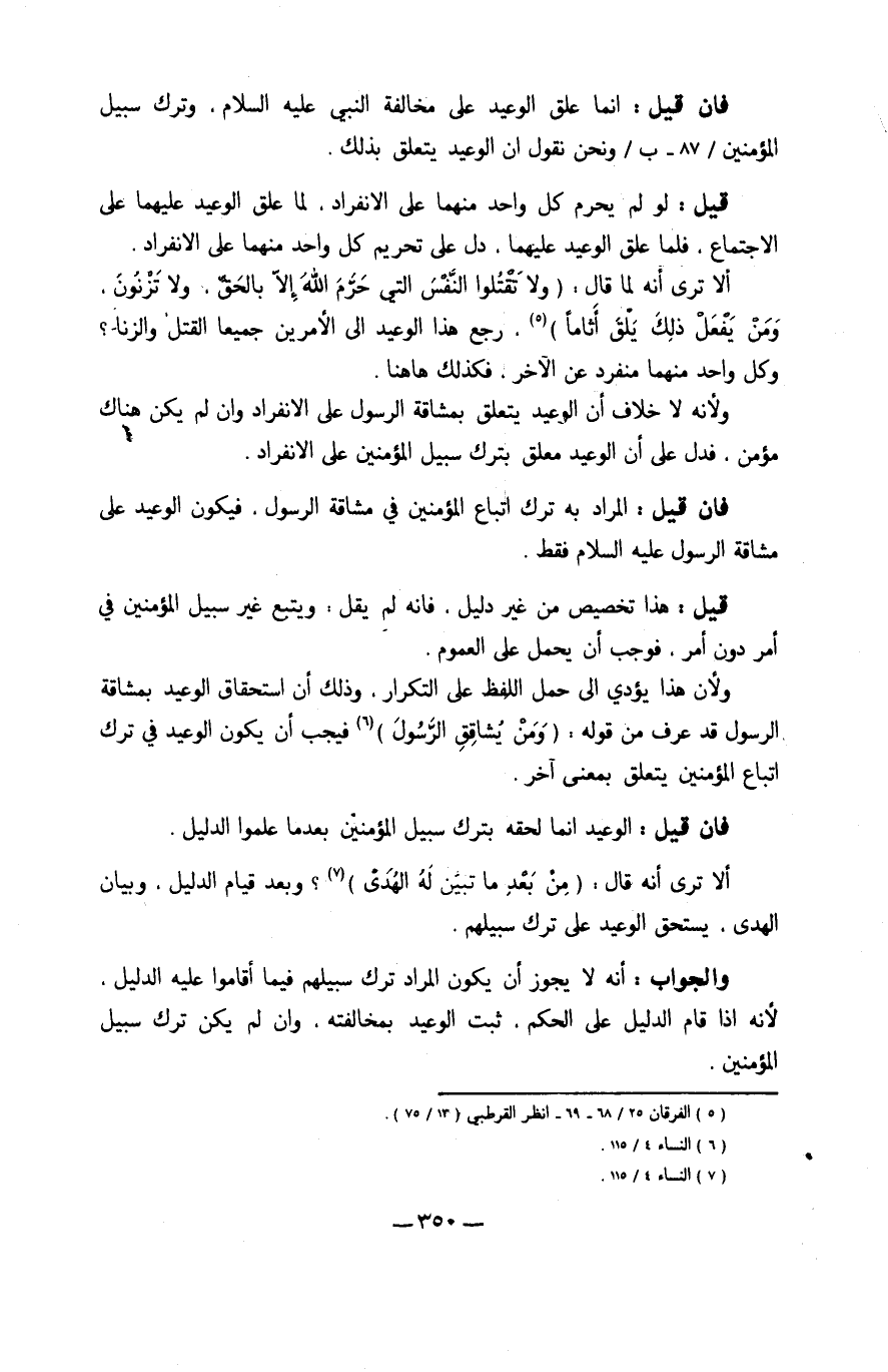 وَالْجَوَاب أَنه لَا يجوز أَن يكون المُرَاد ترك سبيلهم فِيمَا أَقَامُوا عَلَيْهِ الدَّلِيل لِأَنَّهُ إِذا قَامَ الدَّلِيل على الحكم ثَبت الْوَعيد بمخالفته وَإِن لم يكن ترك سَبِيل الْمُؤمنِينَ