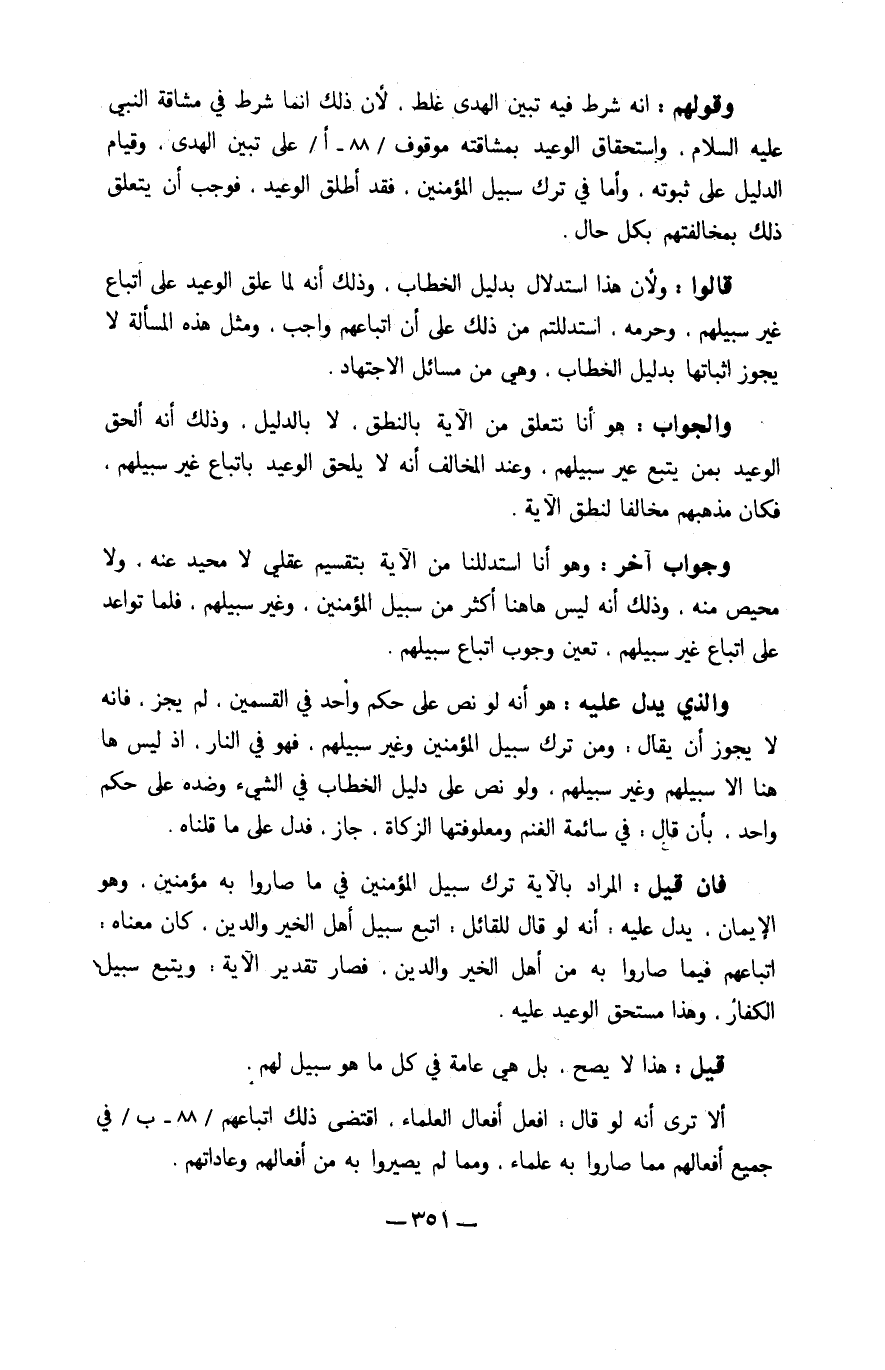 وَجَوَاب آخر وَهُوَ أَنا استدللنا من الْآيَة بتقسيم عَقْلِي لَا محيد عَنهُ وَلَا محيص مِنْهُ وَذَلِكَ أَنه لَيْسَ هَاهُنَا أَكثر من سَبِيل الْمُؤمنِينَ وَغير سبيلهم فَلَمَّا تواعد على اتِّبَاع غير سبيلهم تعين وجوب اتِّبَاع سبيلهم