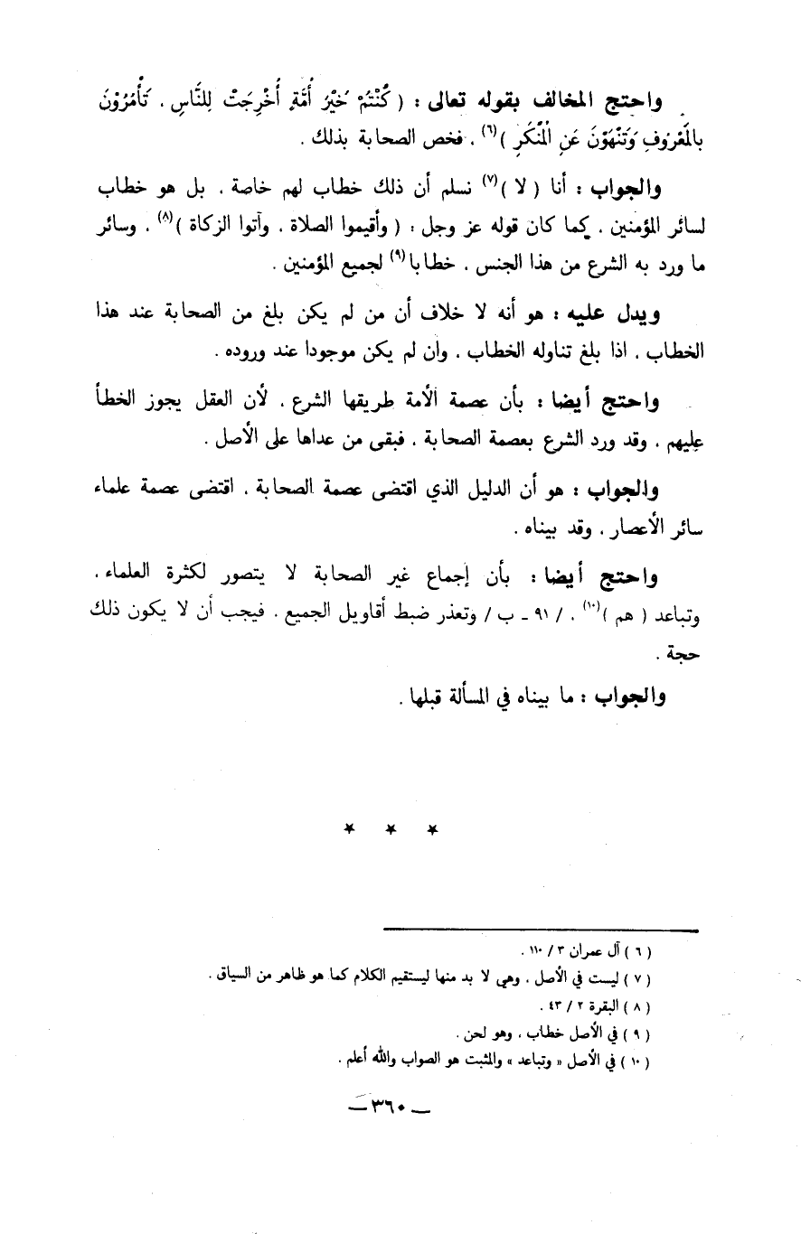 وَاحْتج الْمُخَالف بقوله تَعَالَى {كُنْتُم خير أمة أخرجت للنَّاس تأمرون بِالْمَعْرُوفِ وتنهون عَن الْمُنكر} فَخص الصَّحَابَة بذلك
