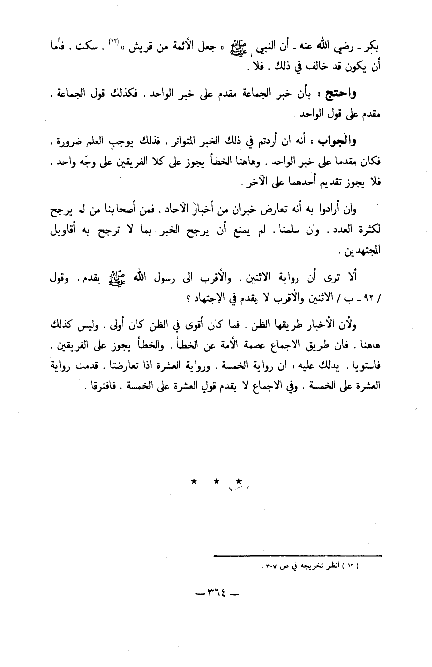 وَالْجَوَاب أَنه إِن أردتم فِي ذَلِك الْخَبَر الْمُتَوَاتر فَذَلِك يُوجب الْعلم ضَرُورَة فَكَانَ مقدما على خبر الْوَاحِد وَهَاهُنَا الْخَطَأ يجوز على كلا الفرقين على وَجه وَاحِد فَلَا يجوز تَقْدِيم أَحدهمَا على الآخر
