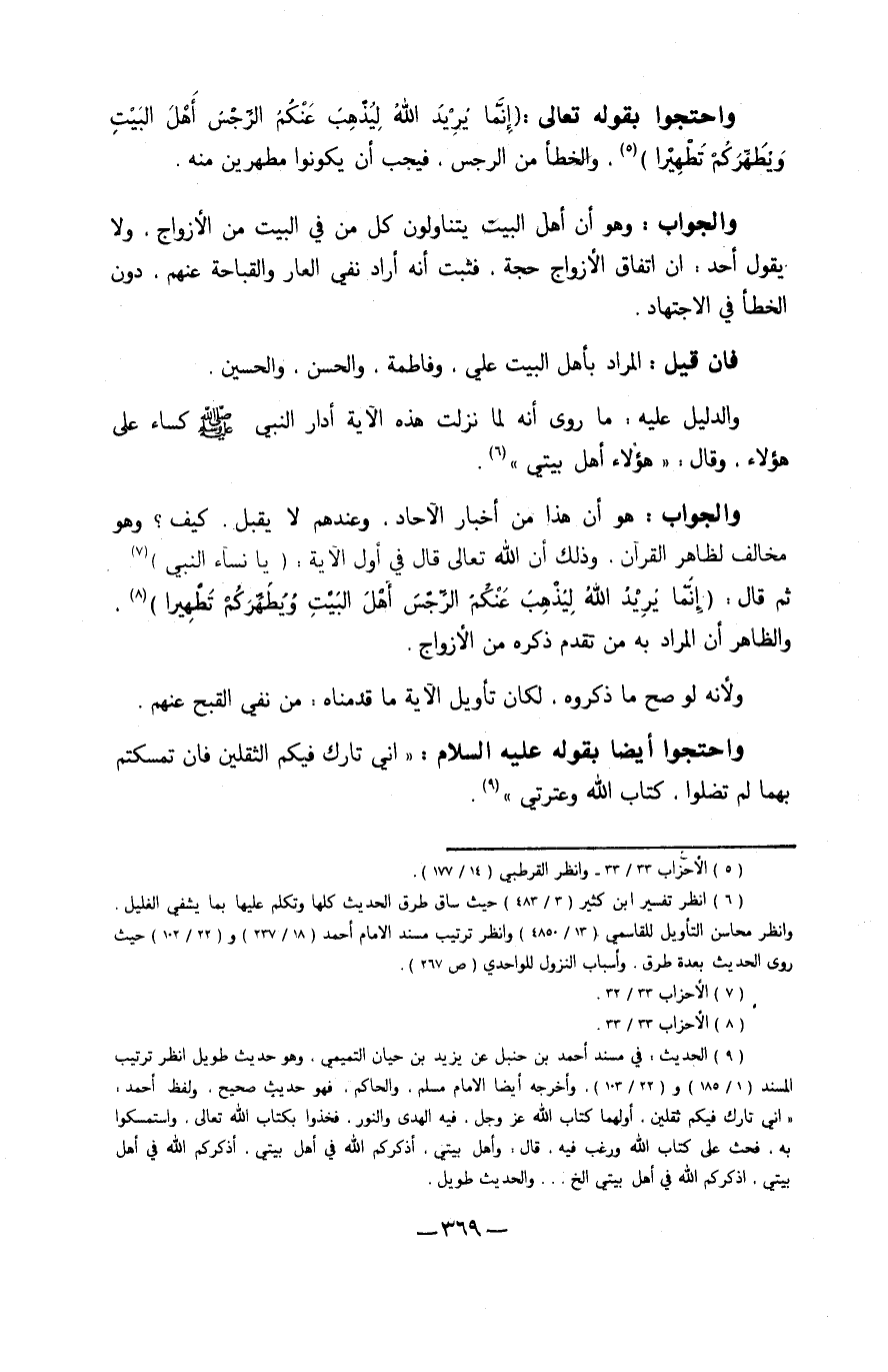 وَاحْتَجُّوا بقوله تَعَالَى {إِنَّمَا يُرِيد الله ليذْهب عَنْكُم الرجس أهل الْبَيْت وَيُطَهِّركُمْ تَطْهِيرا} وَالْخَطَأ من الرجس فَيجب أَن يَكُونُوا مطهرين مِنْهُ