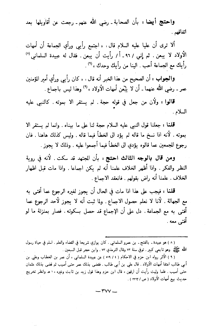 أَلا ترى أَن عليا عَلَيْهِ السَّلَام قَالَ اجْتمع رأبي ورأيي الْجَمَاعَة أَن أُمَّهَات الْأَوْلَاد لَا يبعن ثمَّ إِنِّي رَأَيْت أَن يبعن فَقَالَ لَهُ عُبَيْدَة السَّلمَانِي رَأْيك مَعَ الْجَمَاعَة أحب إِلَيْنَا من رَأْيك وَحدك