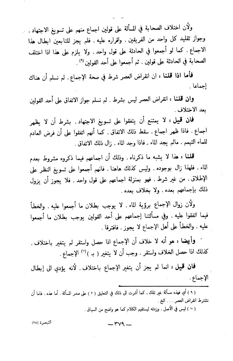 قُلْنَا هَذَا لَا يشبه مَا ذَكرْنَاهُ وَذَلِكَ أَن إِجْمَاعهم فِيمَا ذَكرُوهُ مَشْرُوط بِعَدَمِ المَاء فَلهَذَا زَالَ بِوُجُودِهِ وَلَيْسَ كَذَلِك هَاهُنَا فَإِنَّهُم أَجمعُوا على تسويغ النّظر على الْإِطْلَاق من غير شَرط فَهُوَ بِمَنْزِلَة إِجْمَاعهم على قَول وَاحِد فَلَا يجوز أَن يَزُول ذَلِك بإجماعهم بعده وَلَا بِخِلَاف بعده