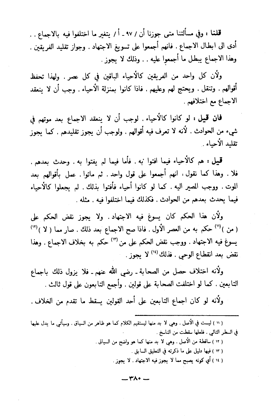 فَإِن قيل لَو كَانُوا كالأحياء لوَجَبَ أَن لَا ينْعَقد الْإِجْمَاع بعد مَوْتهمْ فِي شَيْء من الْحَوَادِث لِأَنَّهُ لَا تعرف فِيهِ أَقْوَالهم ولوجب أَن يجوز تقليدهم كَمَا يجوز تَقْلِيد الْأَحْيَاء
