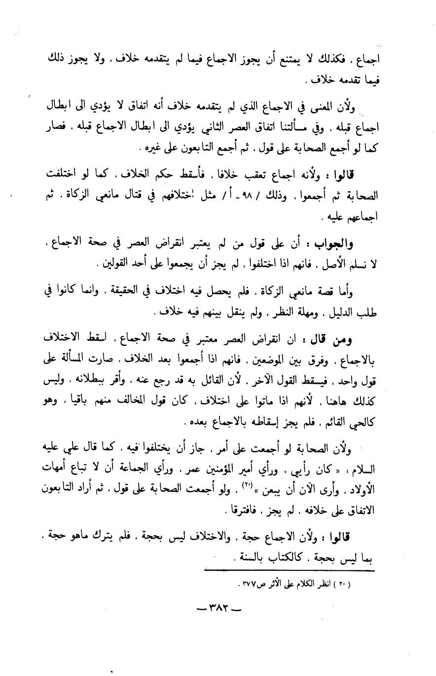 وَلِأَن الصَّحَابَة لَو أَجمعت على أَمر جَازَ أَن يَخْتَلِفُوا فِيهِ كَمَا قَالَ عَليّ عَلَيْهِ السَّلَام كَانَ رَأْيِي ورأي أَمِير الْمُؤمنِينَ عمر ورأي الْجَمَاعَة أَن لَا تبَاع أُمَّهَات الْأَوْلَاد وَأرى الْآن أَن يبعن وَلَو أَجمعت الصَّحَابَة على قَول ثمَّ أَرَادَ التابعون الِاتِّفَاق على خِلَافه لم يجز فَافْتَرقَا