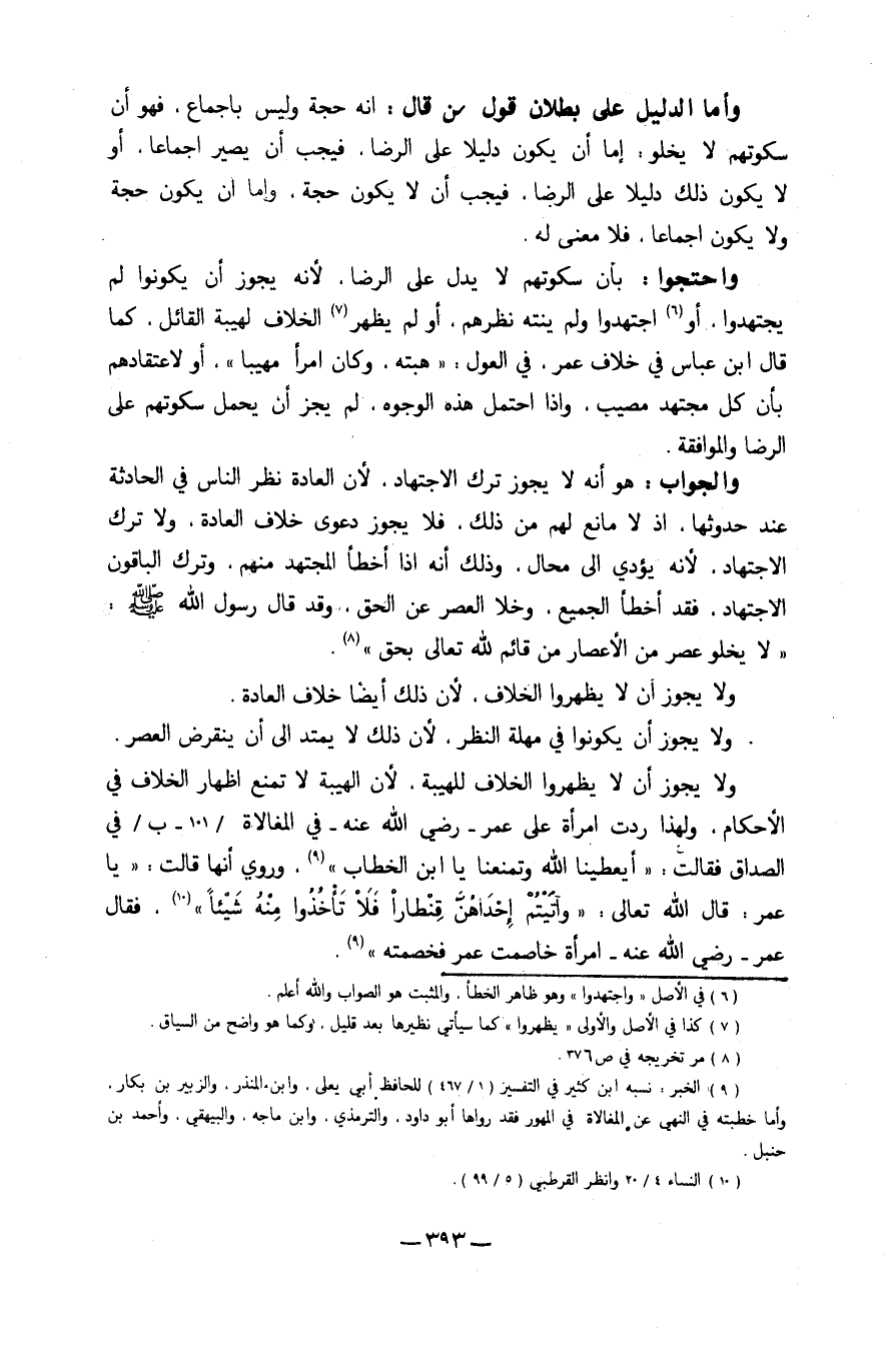 وَلَا يجوز أَن لَا يظهروا الْخلاف للهيبة لِأَن الهيبة لَا تمنع إِظْهَار الْخلاف فِي الْأَحْكَام وَلِهَذَا ردَّتْ امْرَأَة على عمر رَضِي الله عَنهُ فِي المغالاة فِي الصَدَاق فَقَالَت أيعطينا الله وتمنعنا يَا ابْن الْخطاب وَرُوِيَ انها قَالَت يَا عمر قَالَ الله تَعَالَى {وَآتَيْتُم إِحْدَاهُنَّ قِنْطَارًا فَلَا تَأْخُذُوا مِنْهُ شَيْئا} فَقَالَ عمر رَضِي الله عَنهُ امْرَأَة خَاصَمت عمر فَخَصمته