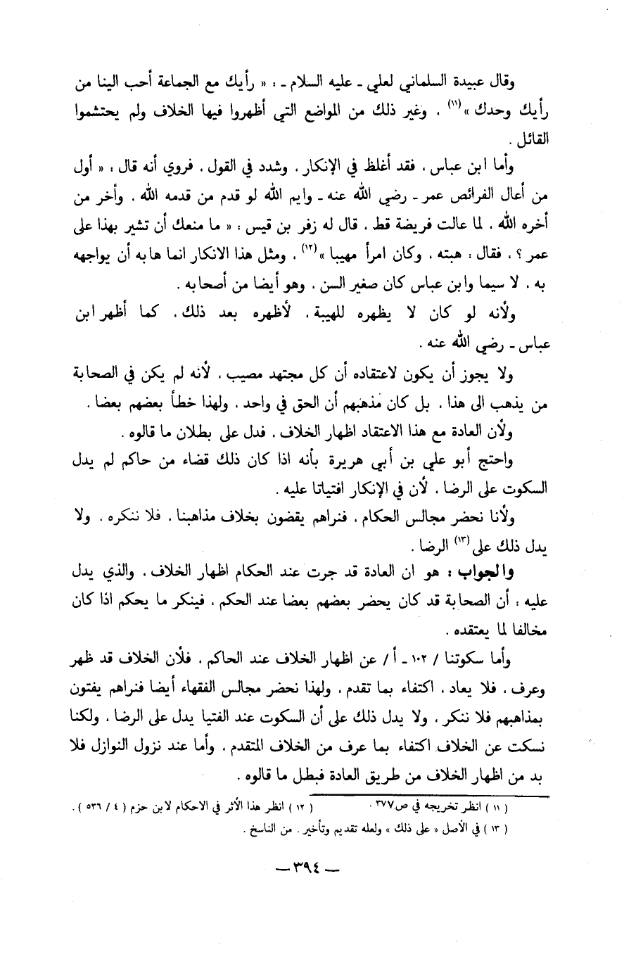 وَقَالَ عُبَيْدَة السَّلمَانِي لعَلي عَلَيْهِ السَّلَام رَأْيك مَعَ الْجَمَاعَة أحب إِلَيْنَا من رَأْيك وَحدك وَغير ذَلِك من الْمَوَاضِع الَّتِي أظهرُوا فِيهَا الْخلاف وَلم يحتشموا الْقَائِل