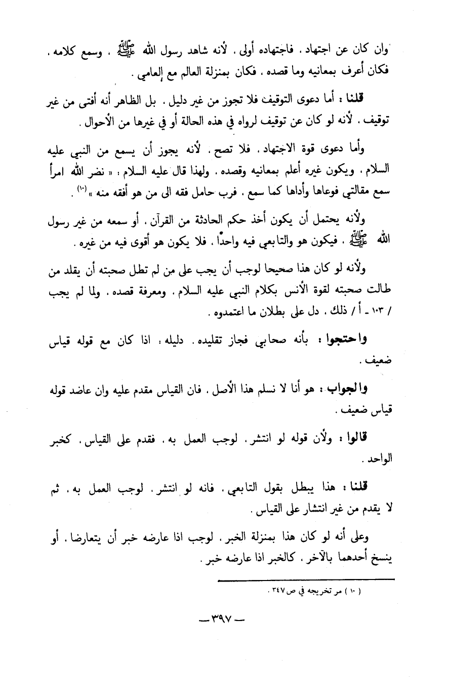 وَلِأَنَّهُ لَو كَانَ صَحِيحا لوَجَبَ أَن يجب على من لم تطل صحبته أَن يُقَلّد من طَالَتْ صحبته لقُوَّة الْأنس بِكَلَام النَّبِي عَلَيْهِ السَّلَام وَمَعْرِفَة قَصده وَلما لم يجب ذَلِك دلّ على بطلَان مَا اعتمدوه