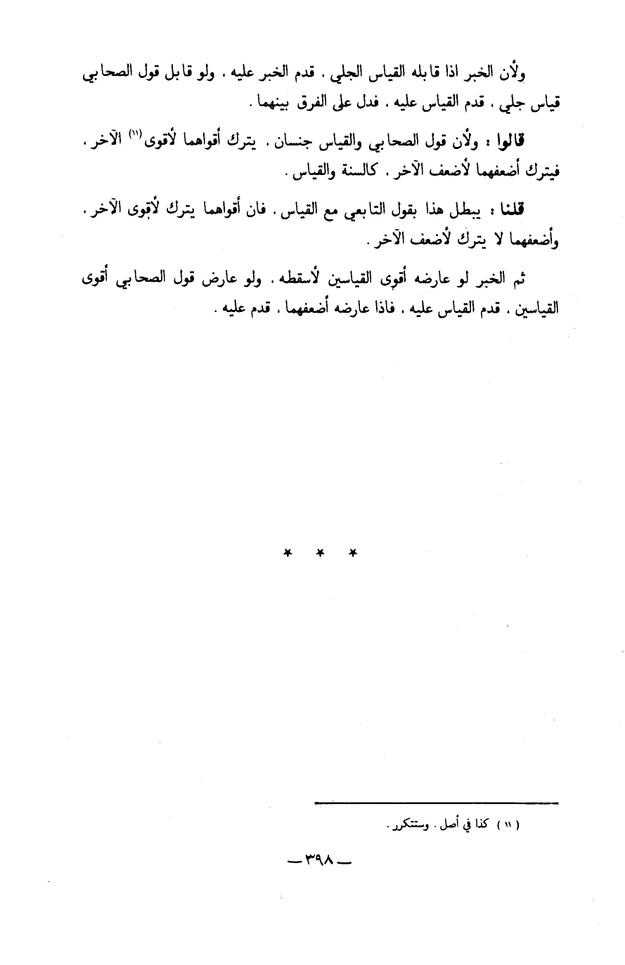 ثمَّ الْخَبَر لَو عَارضه أقوى القياسين لأسقطه وَلَو عَارض قَول الصَّحَابِيّ أقوى القياسين قدم الْقيَاس عَلَيْهِ فَإِذا عَارضه أضعفهما قدم عَلَيْهِ