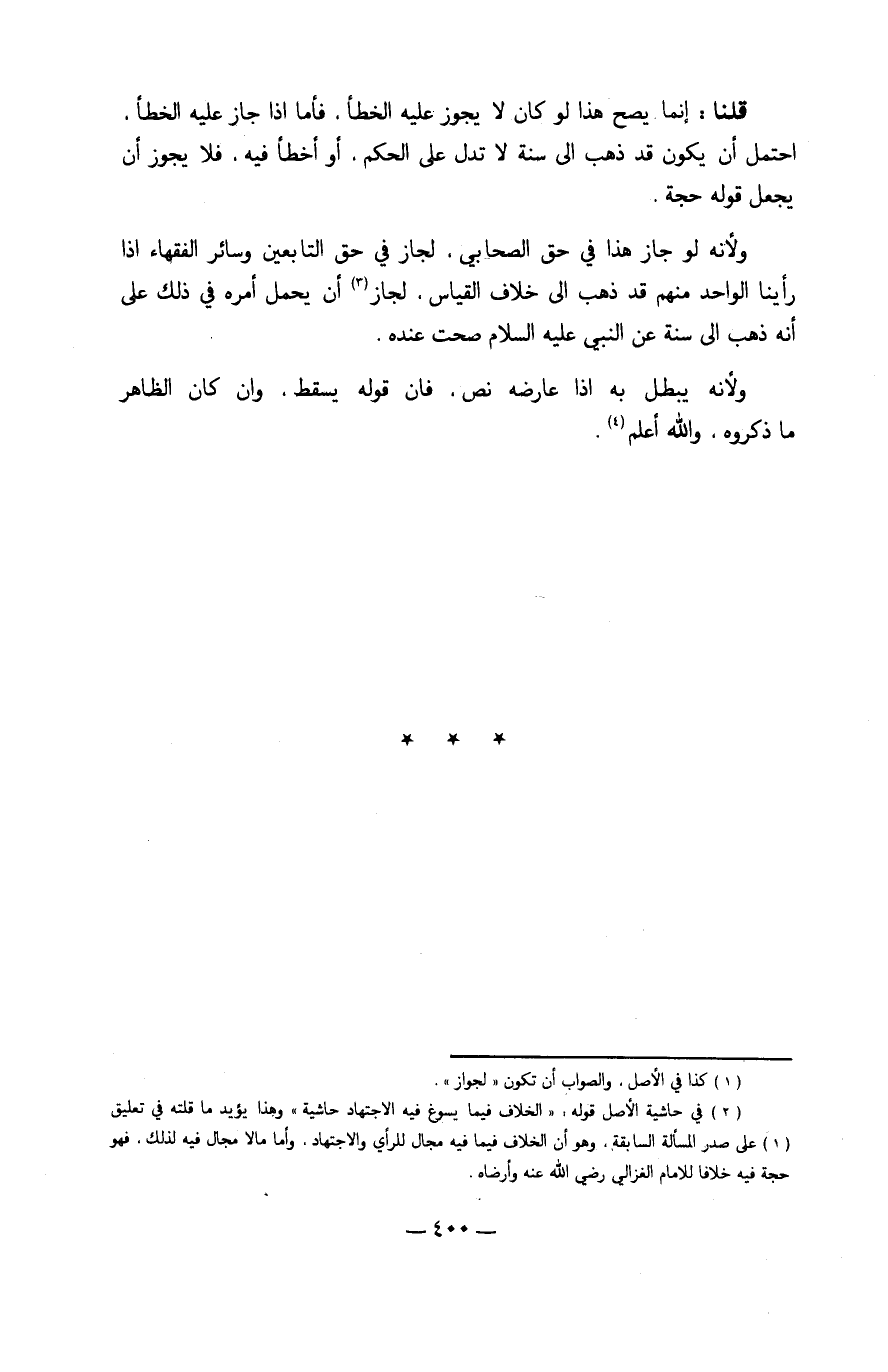 قُلْنَا إِنَّمَا يَصح هَذَا لَو كَانَ لَا يجوز عَلَيْهِ الْخَطَأ فَأَما إِذا جَازَ عَلَيْهِ الْخَطَأ احْتمل أَن يكون قد ذهب إِلَى سنة لَا تدل على الحكم أَو أَخطَأ فِيهِ فَلَا يجوز أَن يَجْعَل قَوْله حجَّة