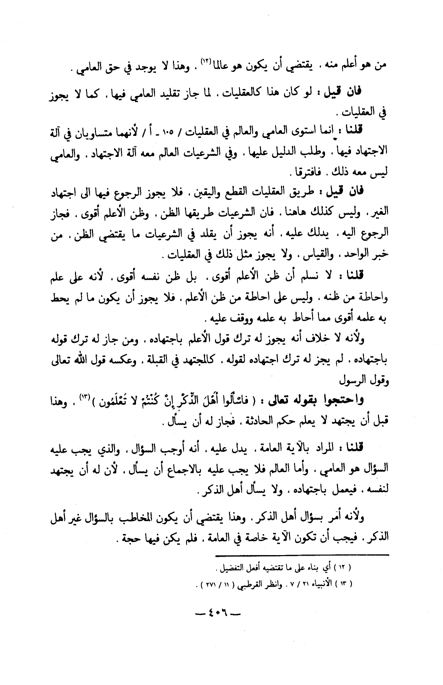 فَإِن قيل طَرِيق العقليات الْقطع وَالْيَقِين فَلَا يجوز الرُّجُوع فِيهَا إِلَى اجْتِهَاد الْغَيْر وَلَيْسَ كَذَلِك هَاهُنَا فَإِن الشرعيات طريقها الظَّن وَظن الأعلم أقوى فَجَاز الرُّجُوع إِلَيْهِ يدلك عَلَيْهِ أَنه يجوز أَن يُقَلّد فِي الشرعيات مَا يَقْتَضِي الظَّن من خبر الْوَاحِد وَالْقِيَاس وَلَا يجوز مثل ذَلِك فِي العقليات