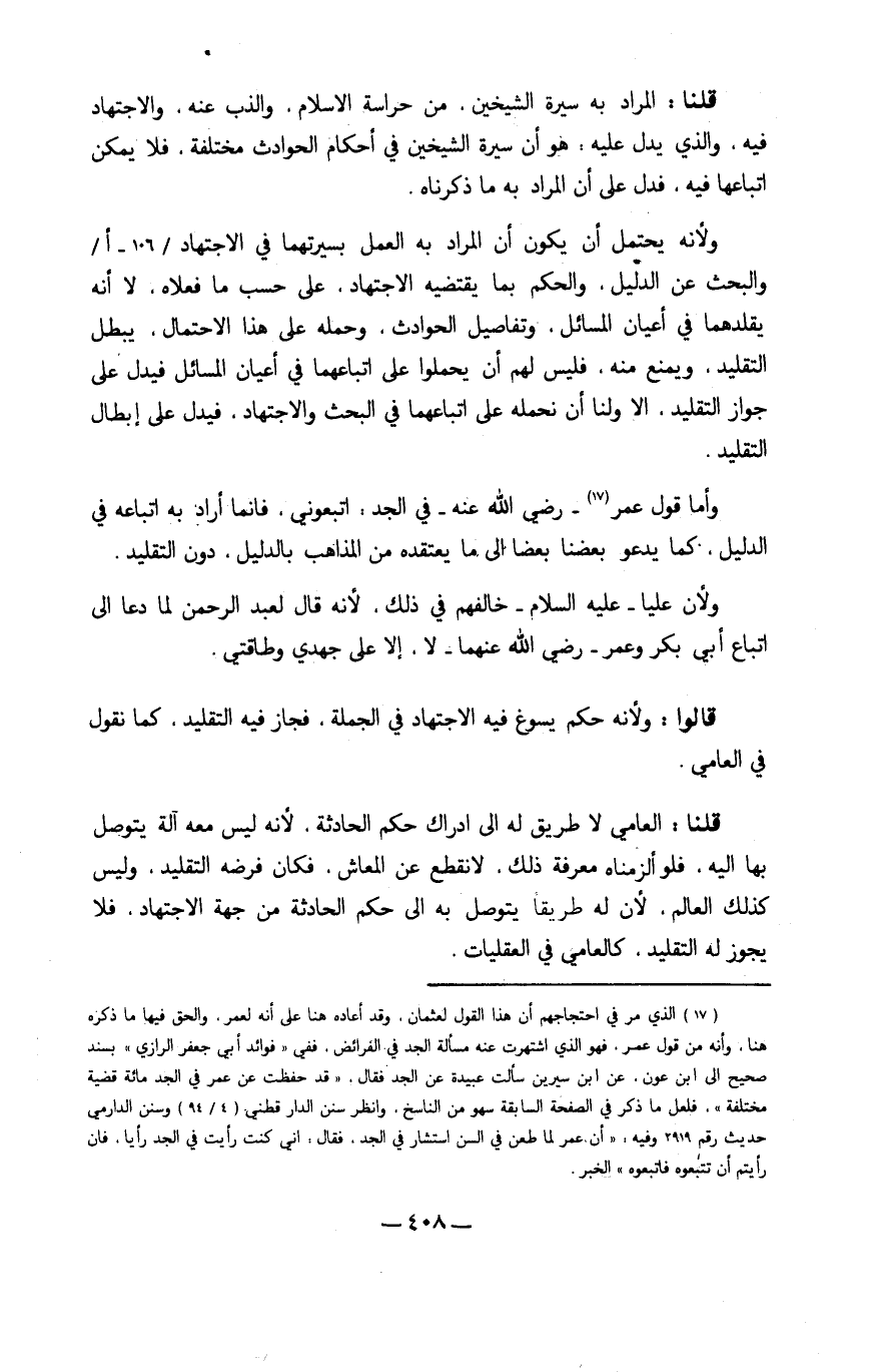 وَأما قَول عمر رَضِي الله عَنهُ فِي الْجد اتبعوني فَإِنَّمَا أَرَادَ بِهِ اتِّبَاعه فِي الدَّلِيل كَمَا يَدْعُو بَعْضنَا بَعْضًا إِلَى مَا يَعْتَقِدهُ من الْمذَاهب بِالدَّلِيلِ دون التَّقْلِيد