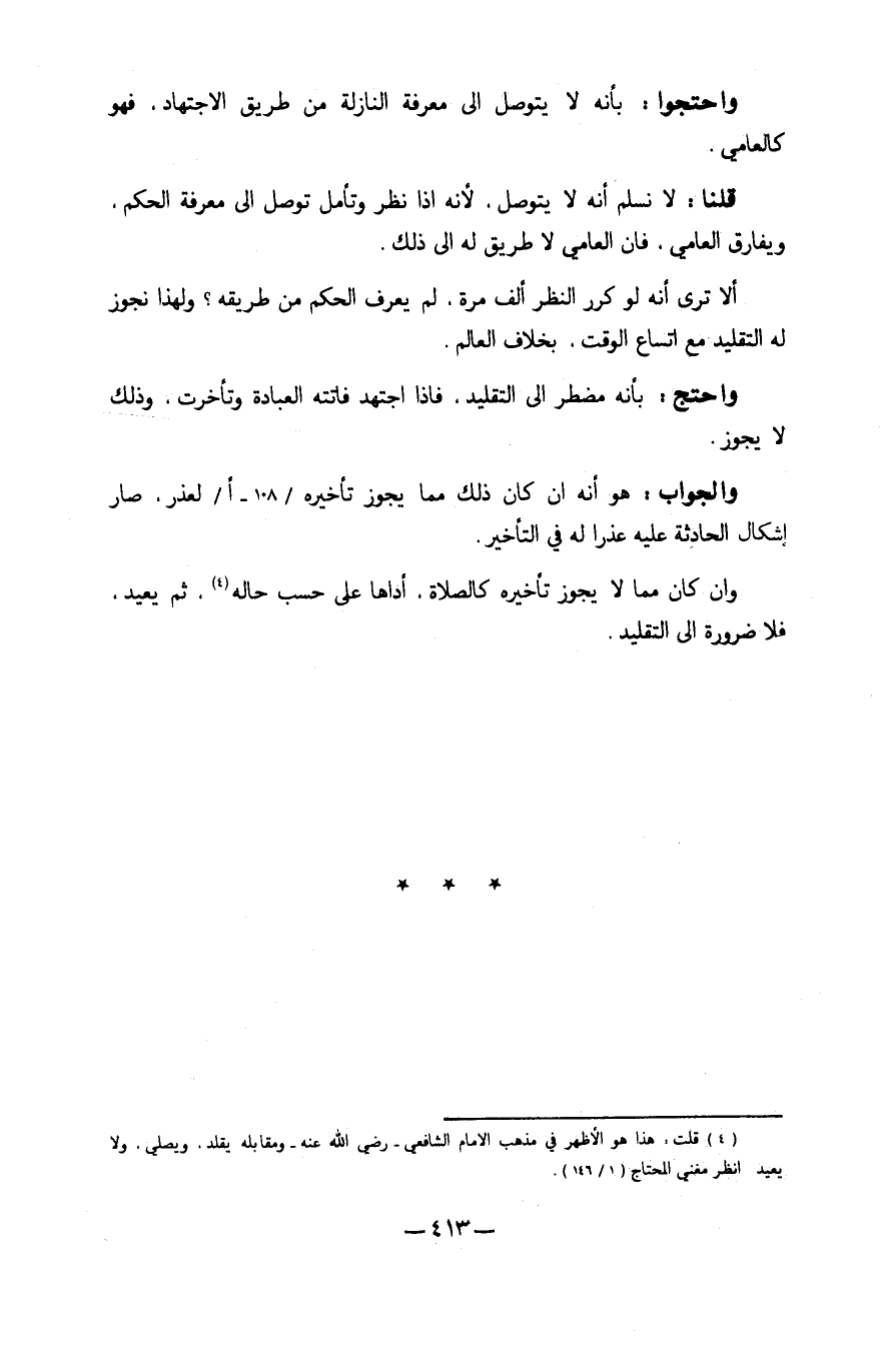 وَاحْتج بِأَنَّهُ مُضْطَر إِلَى التَّقْلِيد فَإِذا اجْتهد فَاتَتْهُ الْعِبَادَة وتأخرت وَذَلِكَ لَا يجوز