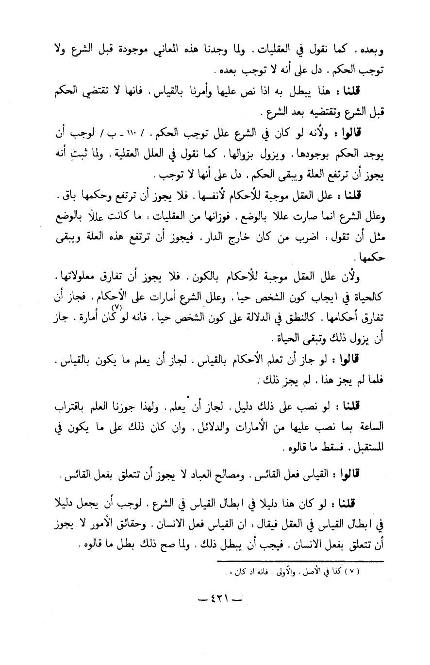قُلْنَا لَو كَانَ هَذَا دَلِيلا فِي إبِْطَال الْقيَاس فِي الشَّرْع لوَجَبَ أَن يَجْعَل دَلِيلا فِي إبِْطَال الْقيَاس فِي الْعقل فَيُقَال إِن الْقيَاس فعل الْإِنْسَان وحقائق الْأُمُور لَا يجوز أَن تتَعَلَّق بِفعل الْإِنْسَان فَيجب أَن يبطل ذَلِك وَلما صَحَّ ذَلِك بَطل مَا قَالُوهُ