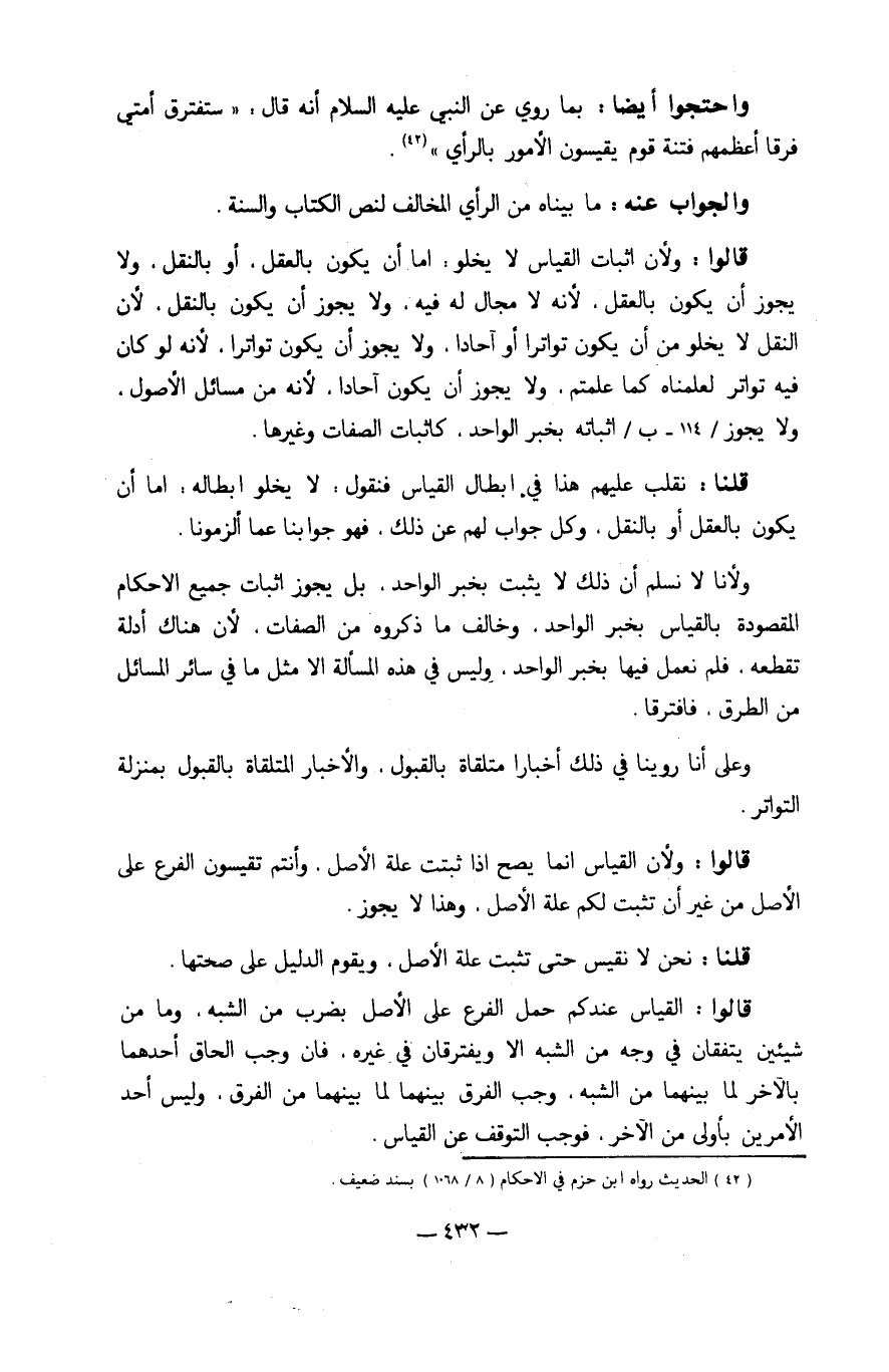 قَالُوا وَلِأَن إِثْبَات الْقيَاس لَا يَخْلُو إِمَّا أَن يكون بِالْعقلِ أَو بِالنَّقْلِ وَلَا يجوز أَن يكون بِالْعقلِ لِأَنَّهُ لَا مجَال لَهُ فِيهِ وَلَا يجوز أَن يكون بِالنَّقْلِ لِأَن النَّقْل لَا يَخْلُو من أَن يكون تواترا أَو آحادا وَلَا يجوز أَن يكون تواترا لِأَنَّهُ لَو كَانَ فِيهِ تَوَاتر لعلمناه كَمَا علمْتُم وَلَا يجوز أَن يكون آحادا لِأَنَّهُ من مسَائِل الْأُصُول وَلَا يجوز إثْبَاته بِخَبَر الْوَاحِد كإثبات الصِّفَات وَغَيرهَا