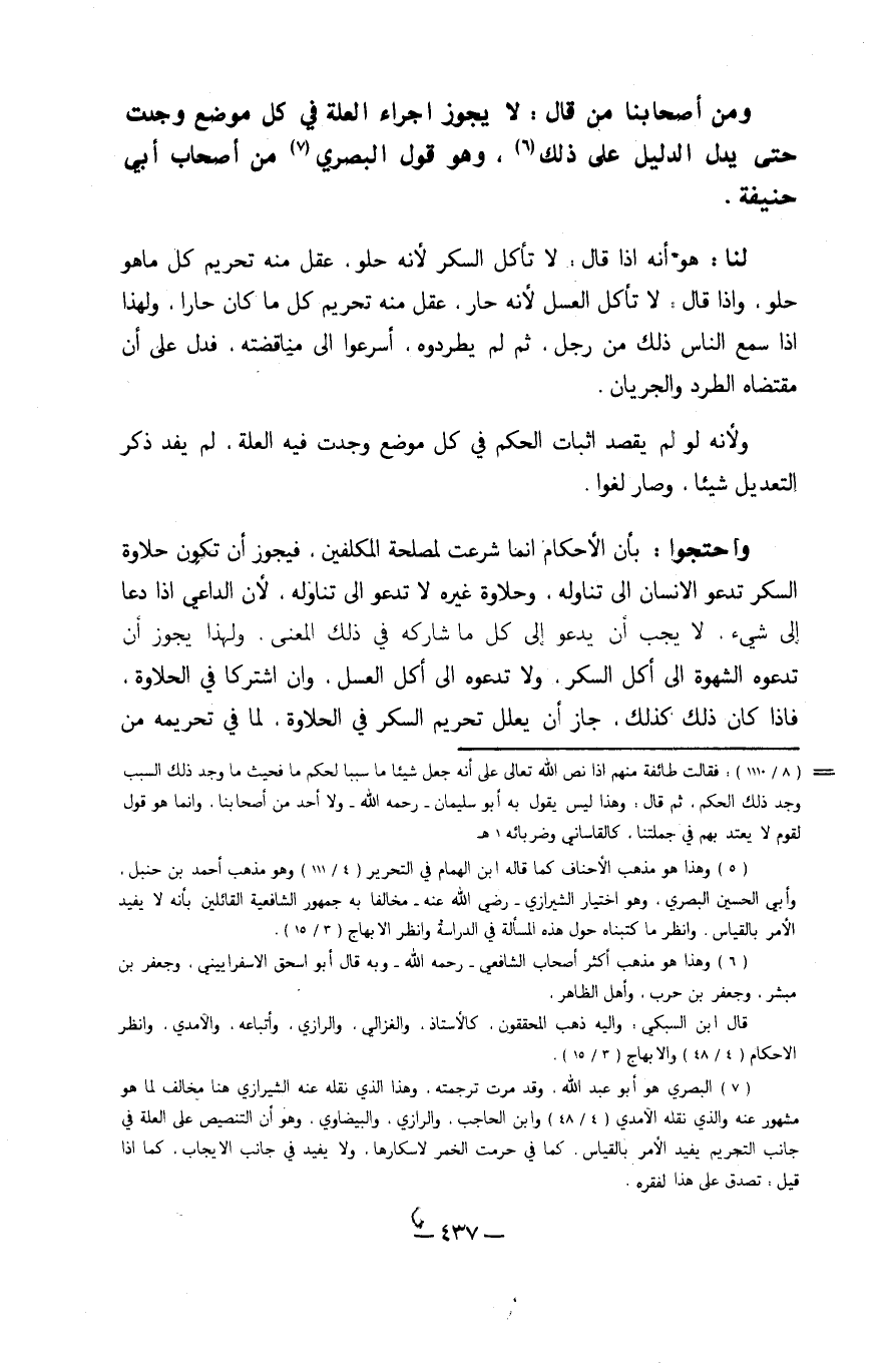 وَمن أَصْحَابنَا من قَالَ لَا يجوز إِجْرَاء الْعلَّة فِي كل مَوضِع وجدت حَتَّى يدل الدَّلِيل على ذَلِك وَهُوَ قَول الْبَصْرِيّ من أَصْحَاب أبي حنيفَة