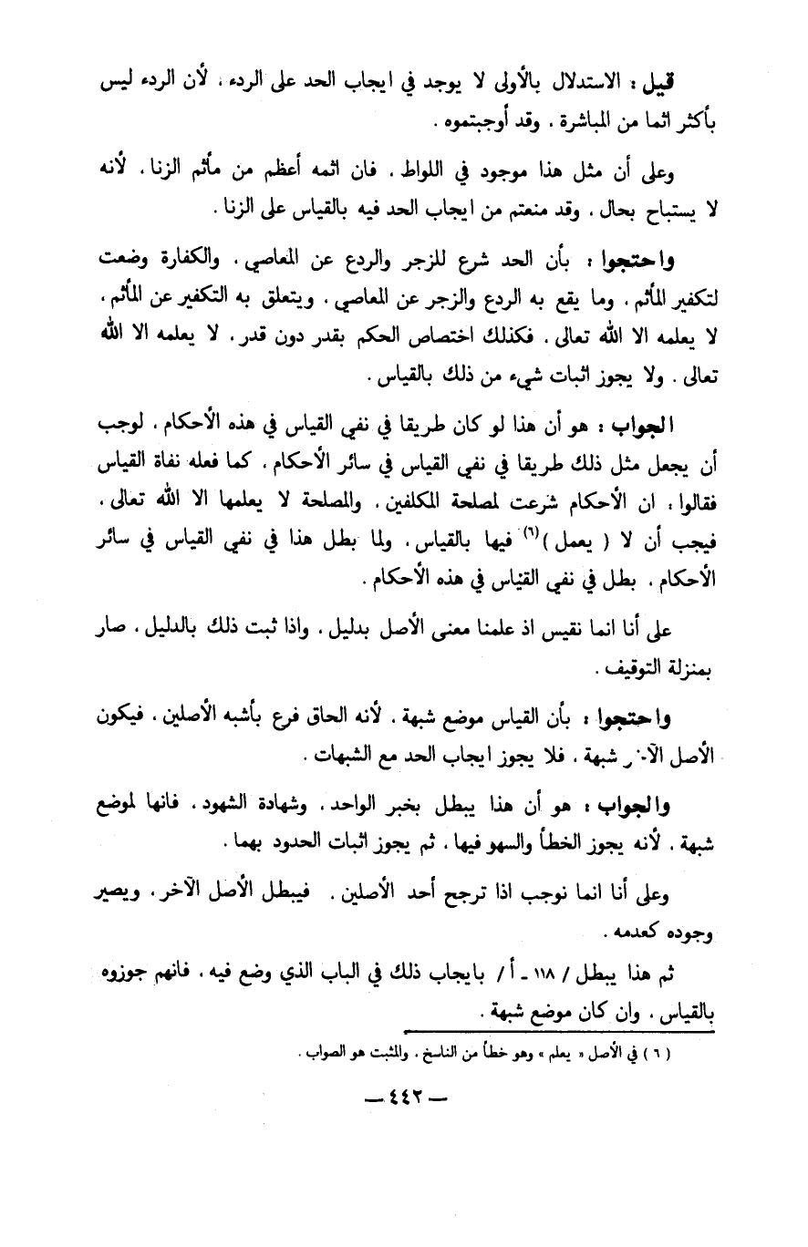 وعَلى أَن مثل هَذَا مَوْجُود فِي اللواط فَإِن إثمه أعظم من مأثم الزِّنَا لِأَنَّهُ لَا يستباح بِحَال وَقد منعتم من إِيجَاب الْحَد فِيهِ بِالْقِيَاسِ على الزِّنَا