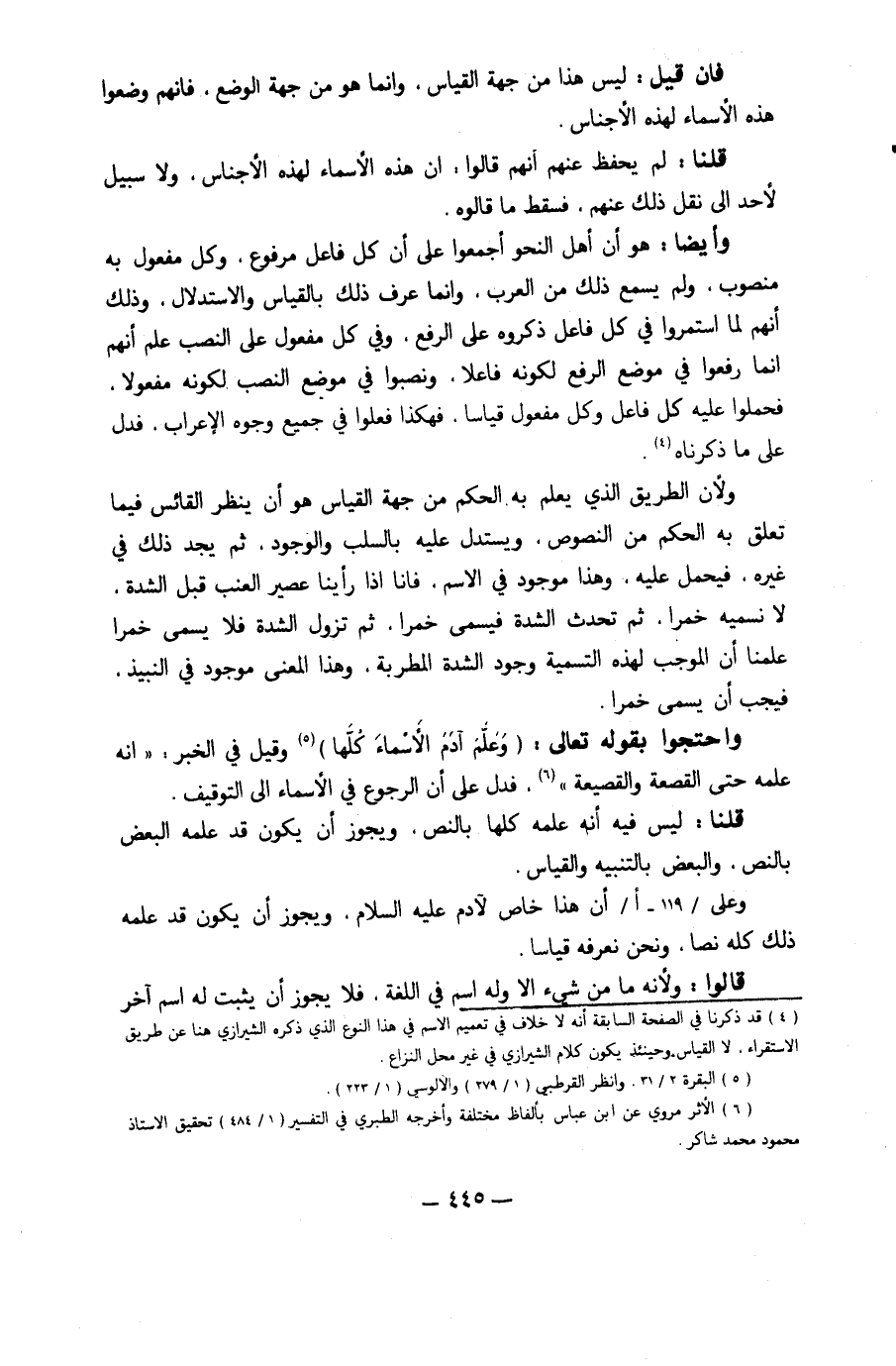 وَأَيْضًا هُوَ أَن أهل النَّحْو أَجمعُوا على أَن كل فَاعل مَرْفُوع وكل مفعول بِهِ مَنْصُوب وَلم يسمع ذَلِك من الْعَرَب وَإِنَّمَا عرف ذَلِك بِالْقِيَاسِ وَالِاسْتِدْلَال وَذَلِكَ أَنهم لما استمروا فِي كل فَاعل ذَكرُوهُ على الرّفْع وَفِي كل مفعول على النصب علم أَنهم إِنَّمَا رفعوا فِي مَوضِع الرّفْع لكَونه فَاعِلا ونصبوا فِي مَوضِع النصب لكَونه مَفْعُولا فحملوا عَلَيْهِ كل فَاعل وكل مفعول قِيَاسا فَهَكَذَا فعلوا فِي جَمِيع وُجُوه الْإِعْرَاب فَدلَّ على مَا ذَكرْنَاهُ