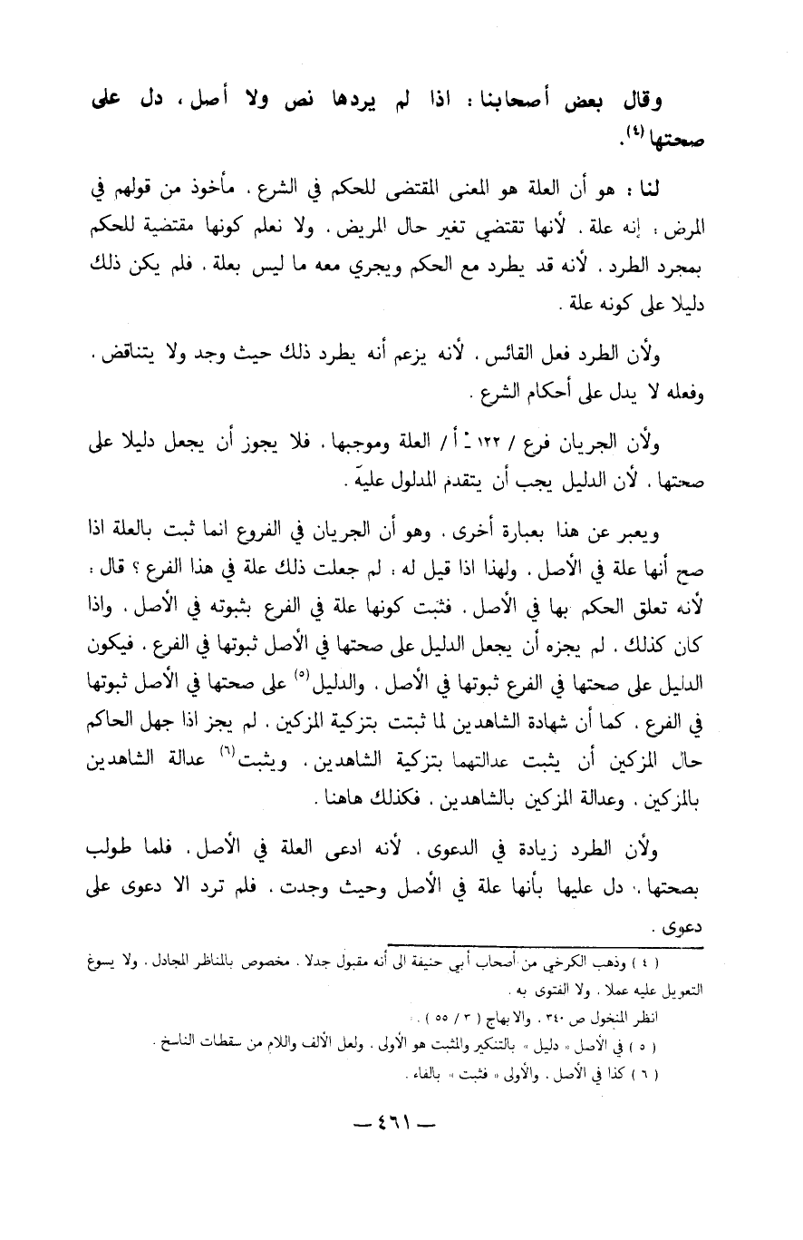 ويعبر عَن هَذَا بِعِبَارَة أُخْرَى وَهُوَ أَن الجريان فِي الْفُرُوع إِنَّمَا ثَبت بِالْعِلَّةِ إِذا صَحَّ أَنَّهَا عِلّة فِي الأَصْل وَلِهَذَا إِذا قيل لَهُ لم جعلت ذَلِك عِلّة فِي هَذَا الْفَرْع قَالَ لِأَنَّهُ تعلق الحكم بهَا فِي الأَصْل فَثَبت كَونهَا عِلّة فِي الْفَرْع بِثُبُوتِهِ فِي الأَصْل وَإِذا كَانَ كَذَلِك لم يجزه أَن يَجْعَل الدَّلِيل على صِحَّتهَا فِي الأَصْل ثُبُوتهَا فِي الْفَرْع فَيكون الدَّلِيل على صِحَّتهَا فِي الْفَرْع ثُبُوتهَا فِي الأَصْل وَالدَّلِيل على صِحَّتهَا فِي الأَصْل ثُبُوتهَا فِي الْفَرْع وَالدَّلِيل على صِحَّتهَا فِي الأَصْل ثُبُوتهَا فِي الْفَرْع كَمَا أَن شَهَادَة الشَّاهِدين لما ثبتَتْ بتزكية المزكين لم يجز إِذا جهل الْحَاكِم حَال المزكين أَن يثبت عدالتهما بتزكية الشَّاهِدين وَيثبت عَدَالَة الشَّاهِدين بالمزكين وعدالة المزكين بالشاهدين فَكَذَلِك هَاهُنَا