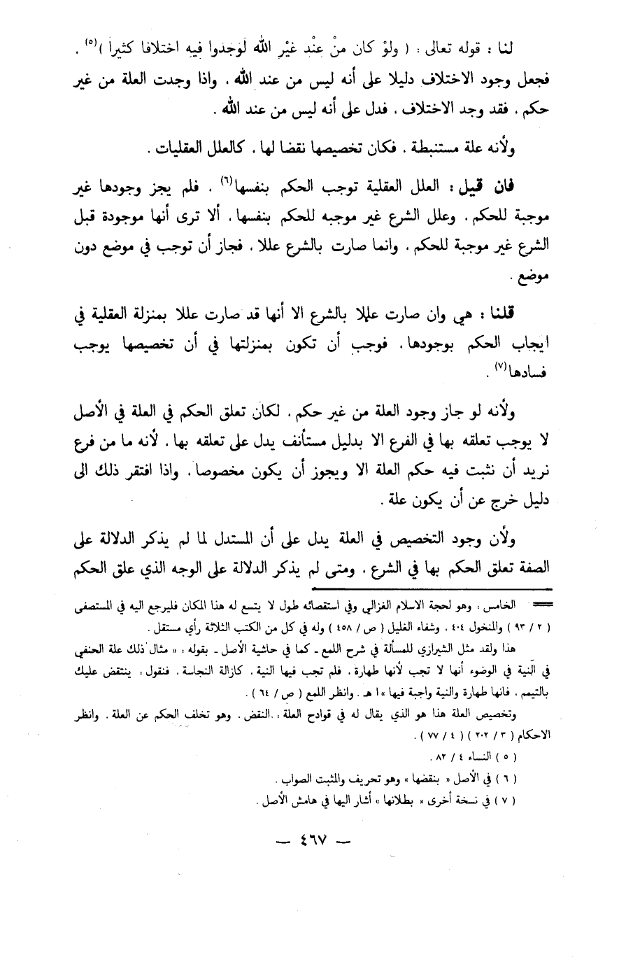 لنا قَوْله تَعَالَى {وَلَو كَانَ من عِنْد غير الله لوجدوا فِيهِ اخْتِلَافا كثيرا} فَجعل وجود الِاخْتِلَاف دَلِيلا على أَنه لَيْسَ من عِنْد الله وَإِذا وجدت الْعلَّة من غير حكم فقد وجد الِاخْتِلَاف فَدلَّ على أَنه لَيْسَ من عِنْد الله