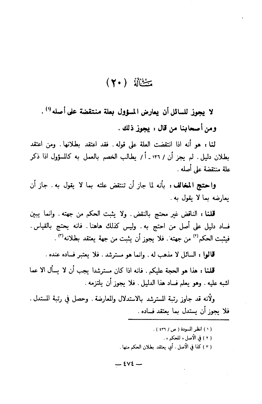 لَا يجوز للسَّائِل أَن يُعَارض المسؤول بعلة منتقضة على أَصله