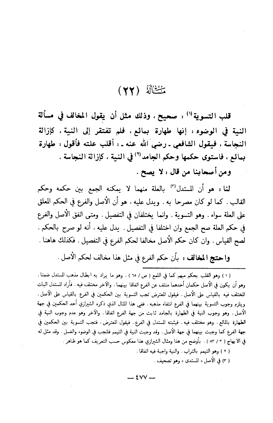 قلب التَّسْوِيَة صَحِيح وَذَلِكَ مثل أَن يَقُول الْمُخَالف فِي مَسْأَلَة النِّيَّة فِي الْوضُوء إِنَّهَا طَهَارَة بمائع فَلم تفْتَقر إِلَى النِّيَّة كإزالة النَّجَاسَة فَيَقُول الشَّافِعِي رَضِي الله عَنهُ أقلب علته فَأَقُول طَهَارَة بمائع فَاسْتَوَى حكمهَا وَحكم الجامد فِي النِّيَّة كإزالة النَّجَاسَة
