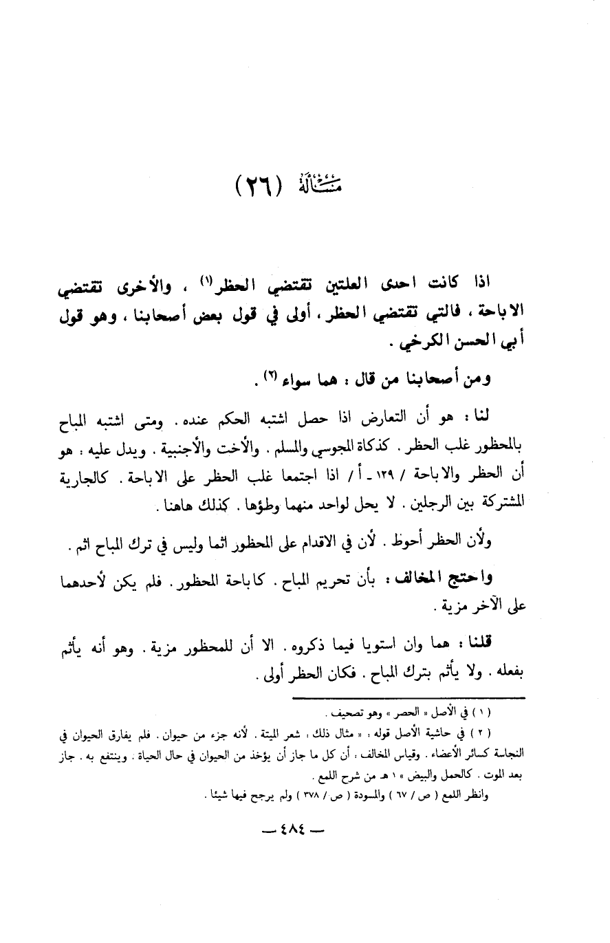 إِذا كَانَت إِحْدَى العلتين تَقْتَضِي الْحَظْر وَالْأُخْرَى تَقْتَضِي الْإِبَاحَة فالتي تَقْتَضِي الْحَظْر أولى فِي قَول بعض أَصْحَابنَا وَهُوَ قَول أبي الْحسن الْكَرْخِي