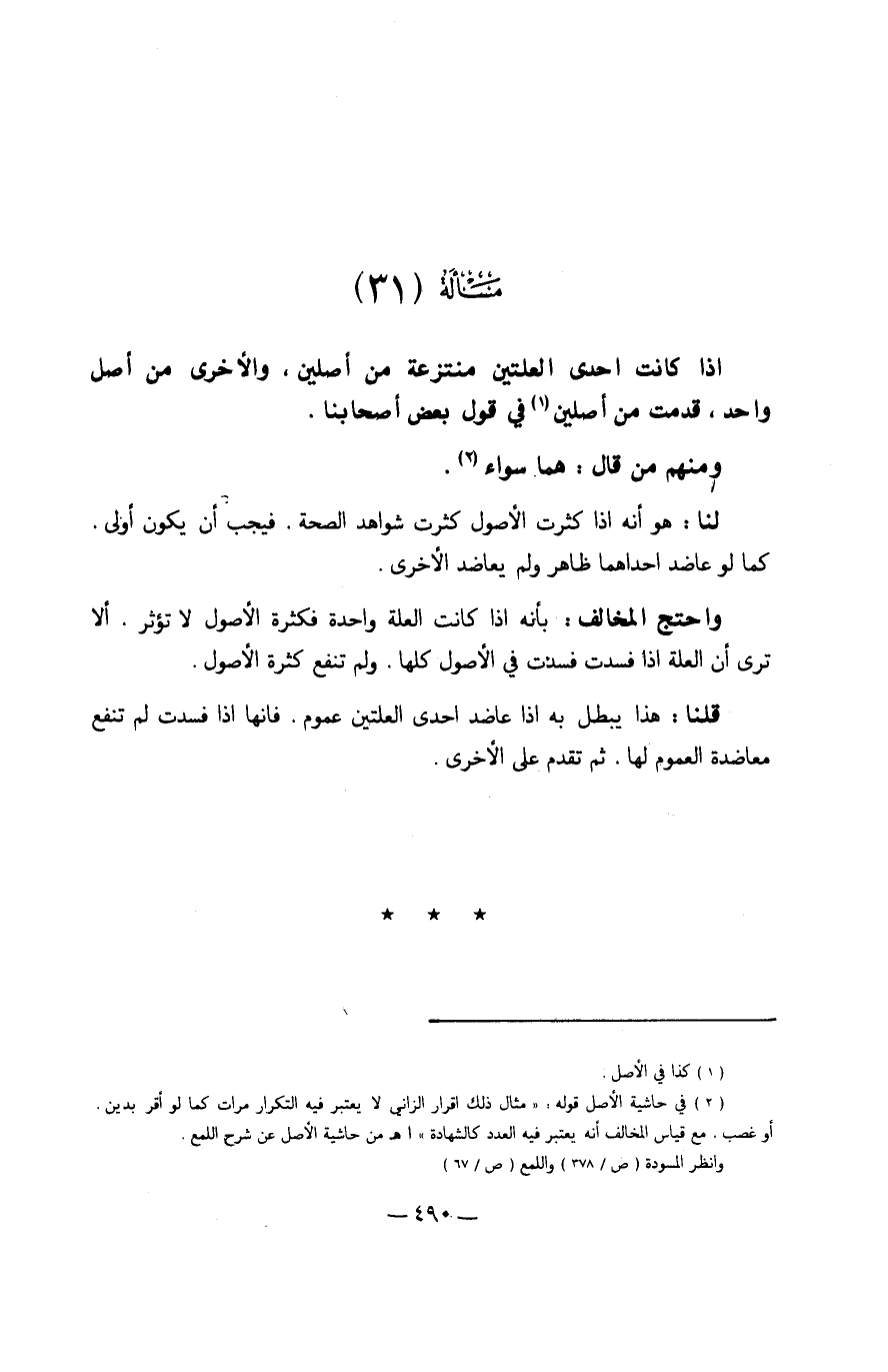 وَاحْتج الْمُخَالف بِأَنَّهُ إِذا كَانَت الْعلَّة وَاحِدَة فكثرة الْأُصُول لَا تُؤثر أَلا ترى أَن الْعلَّة إِذا فَسدتْ فَسدتْ فِي الْأُصُول كلهَا وَلم تَنْفَع كَثْرَة الْأُصُول