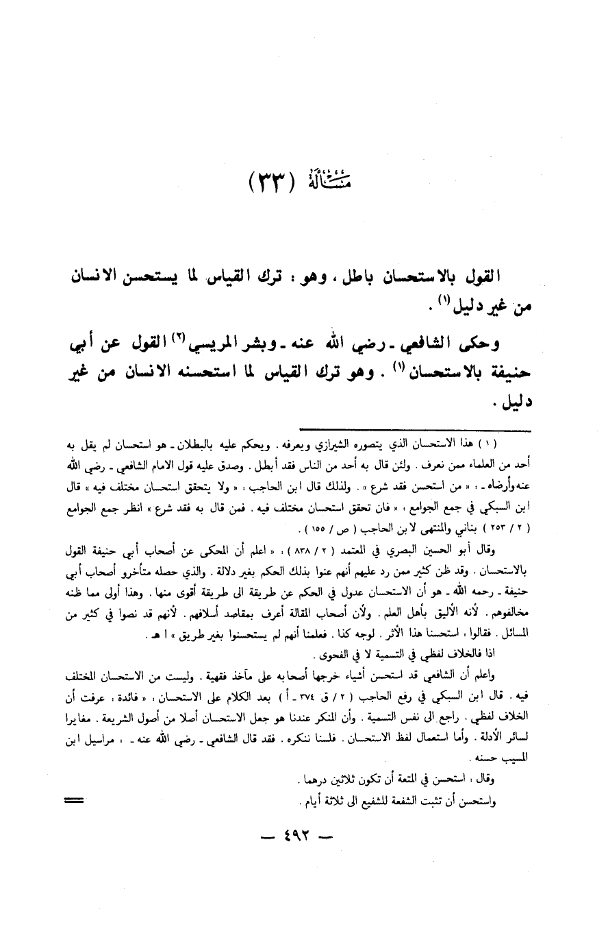 وَحكى الشَّافِعِي رَضِي الله عَنهُ وَبشر المريسي القَوْل عَن أبي حنيفَة بالاستحسان وَهُوَ ترك الْقيَاس لما استحسنه الْإِنْسَان من غير دَلِيل